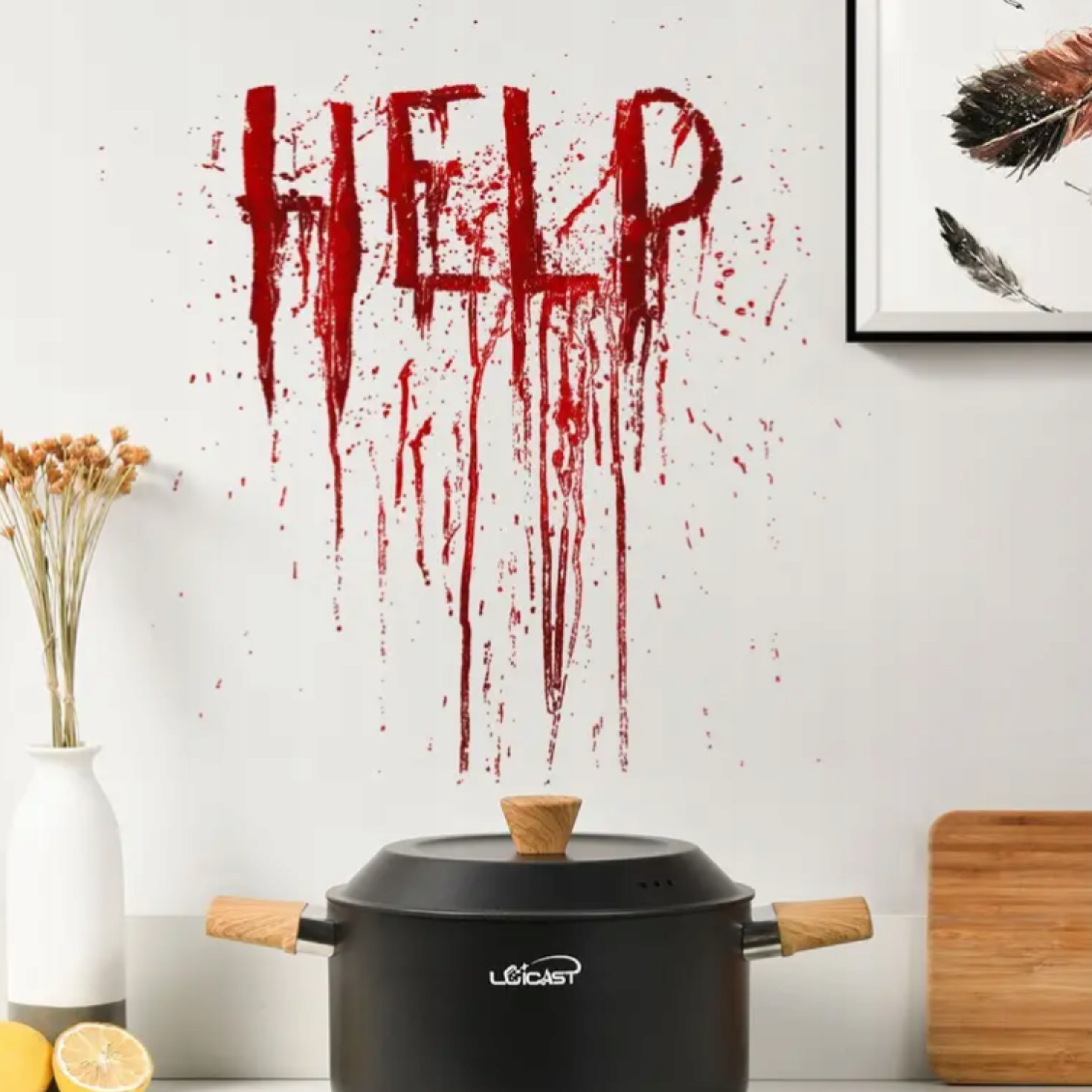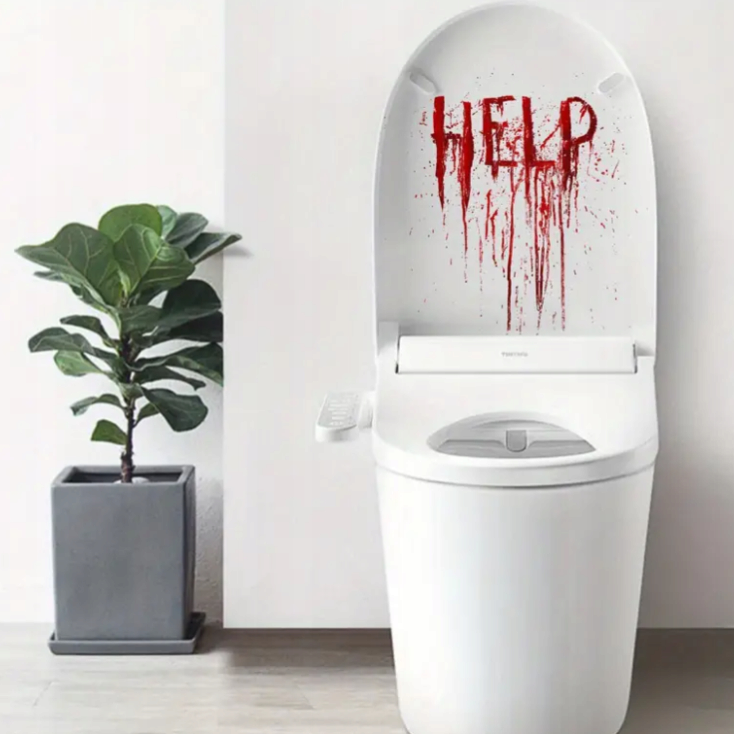 Большая наклейка «ПОМОЩЬ» 30×60 см с реалистичными, «кровавыми» пятнами мгновенно превращает ванную, коридор или дверь в сцену ужасов.