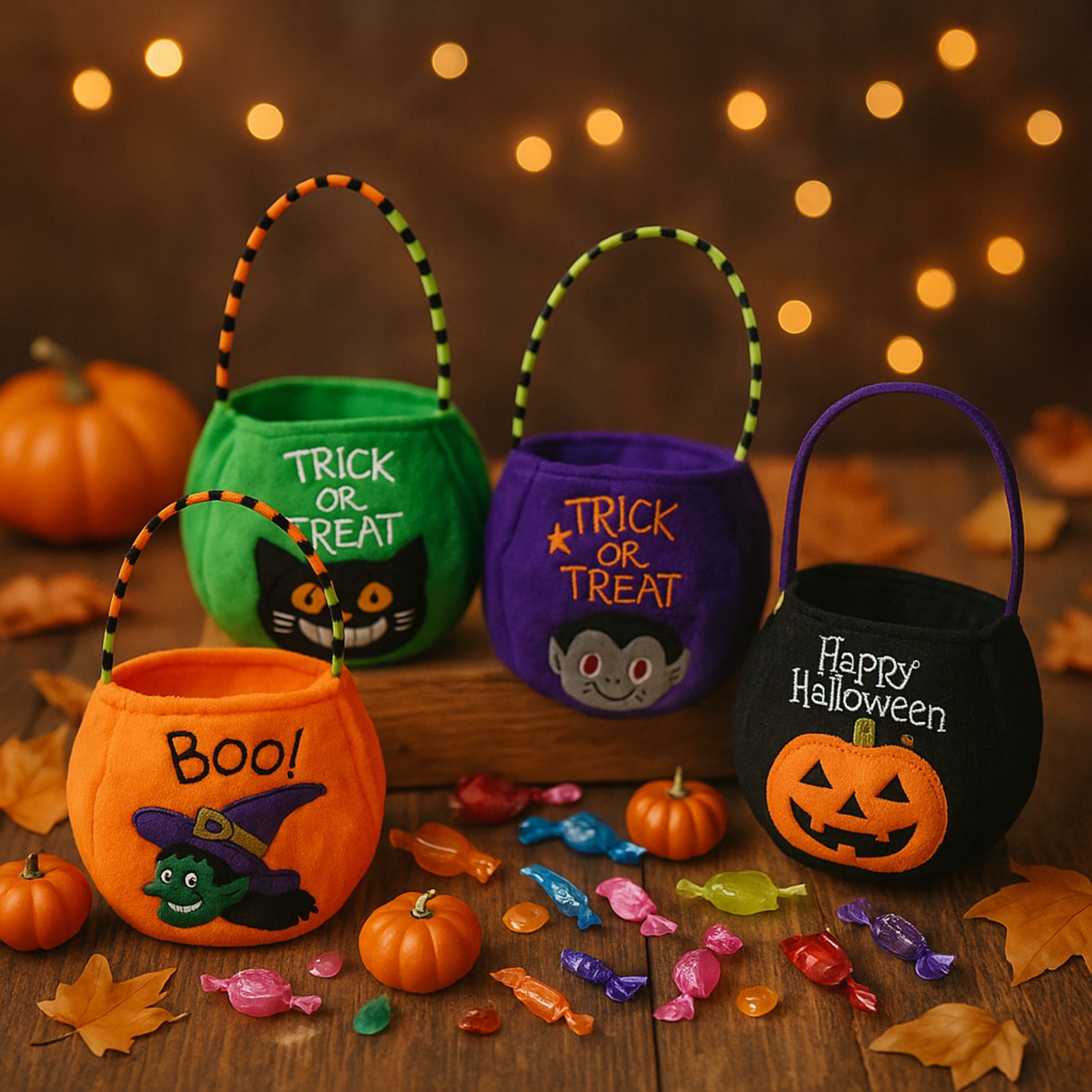 Выберите мягкое фетровое ведро в форме тыквы с вышитыми мотивами (ведьма, «БУ!», кот, «Счастливого Хэллоуина»). Сумка легкая, вместительная и удобная для маленьких ручек, поэтому дети с удовольствием носят ее весь вечер.