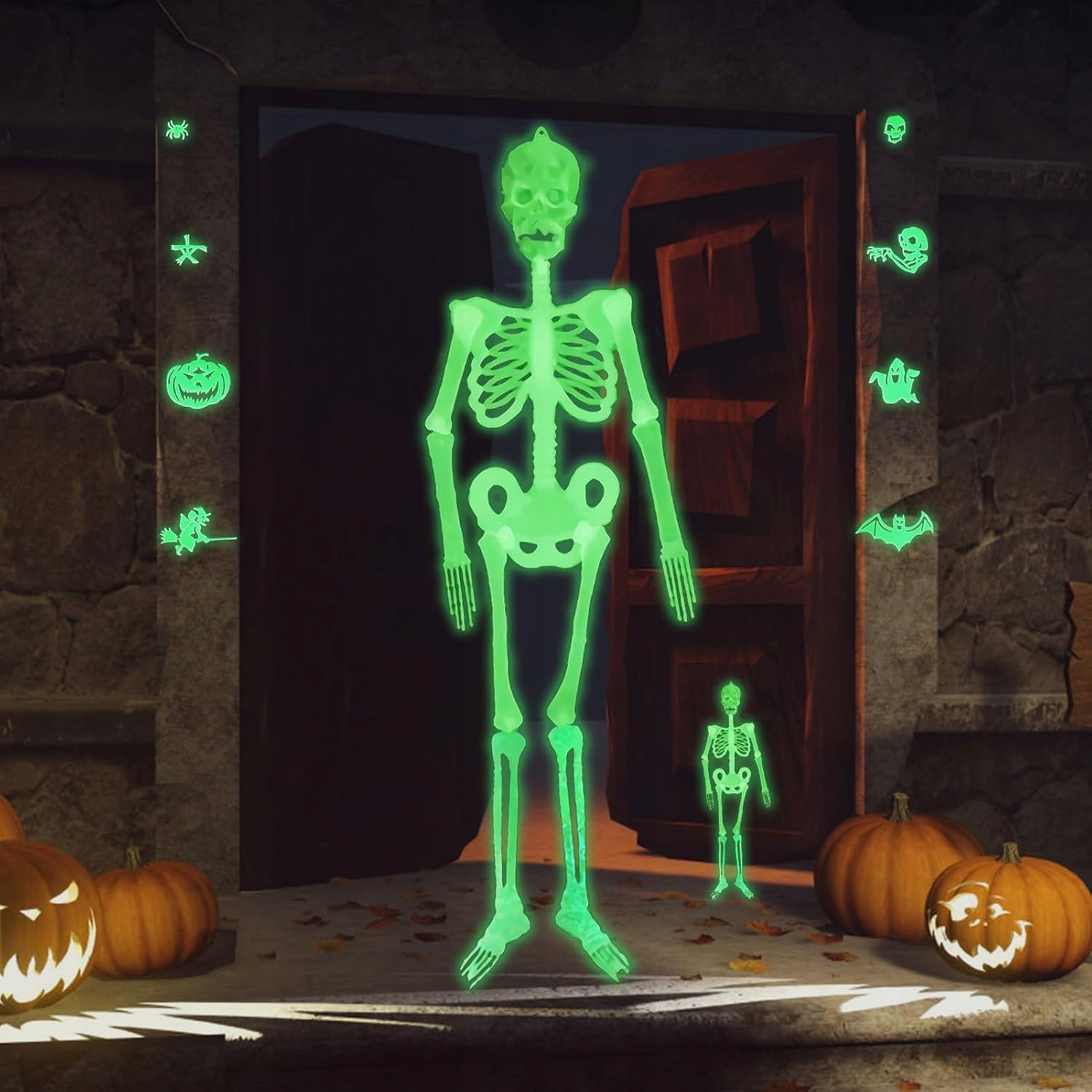 2x Хэллоуин Украшения, сияющие в темноте! Он содержит два размера костей разных размеров, 150 см и 30 см, которые идеально подходят для украшения дома, сада или тематического события. Благодаря прикрепленным наклейкам вы можете дополнительно обогатить свое украшение, добавив уникальный, ужасный акцент