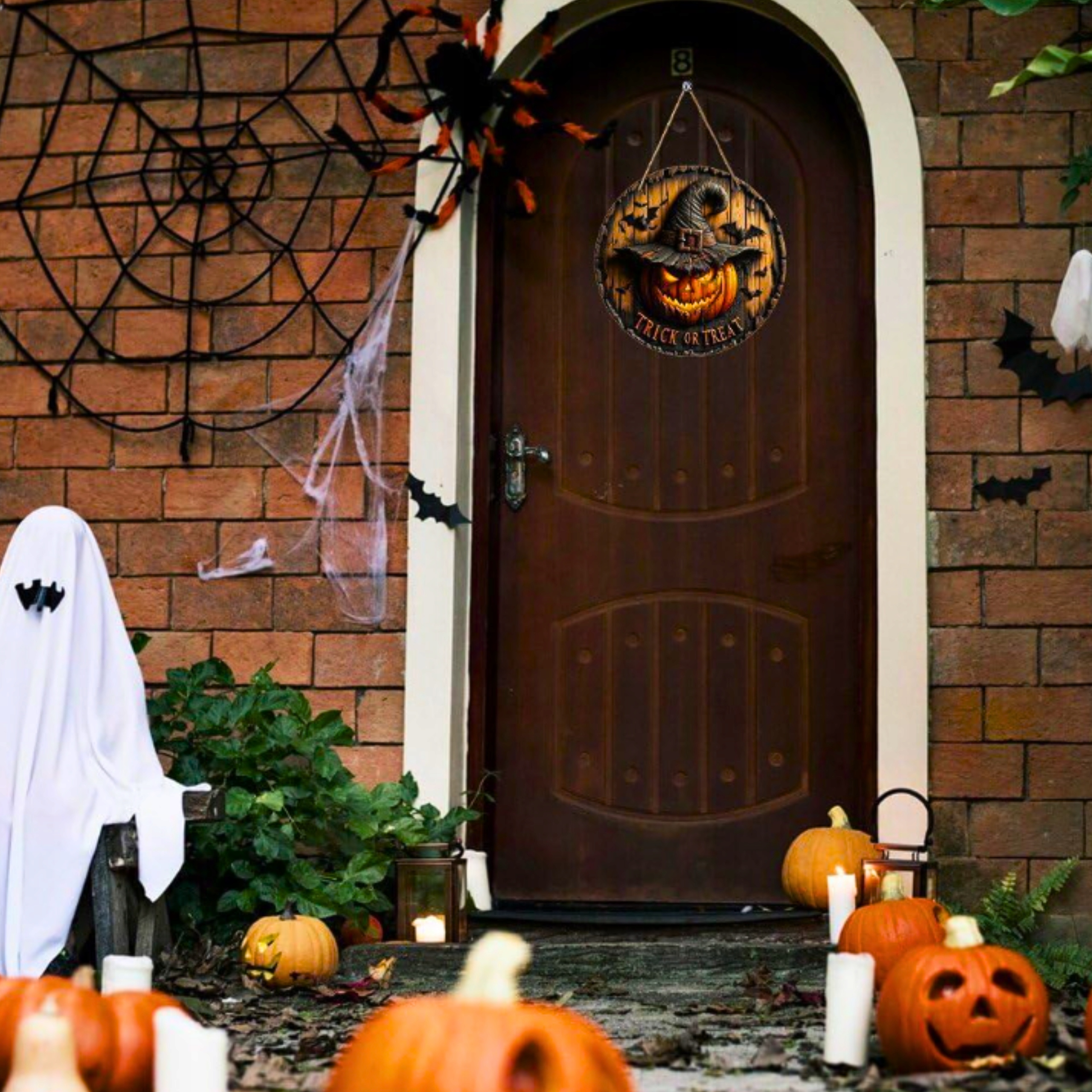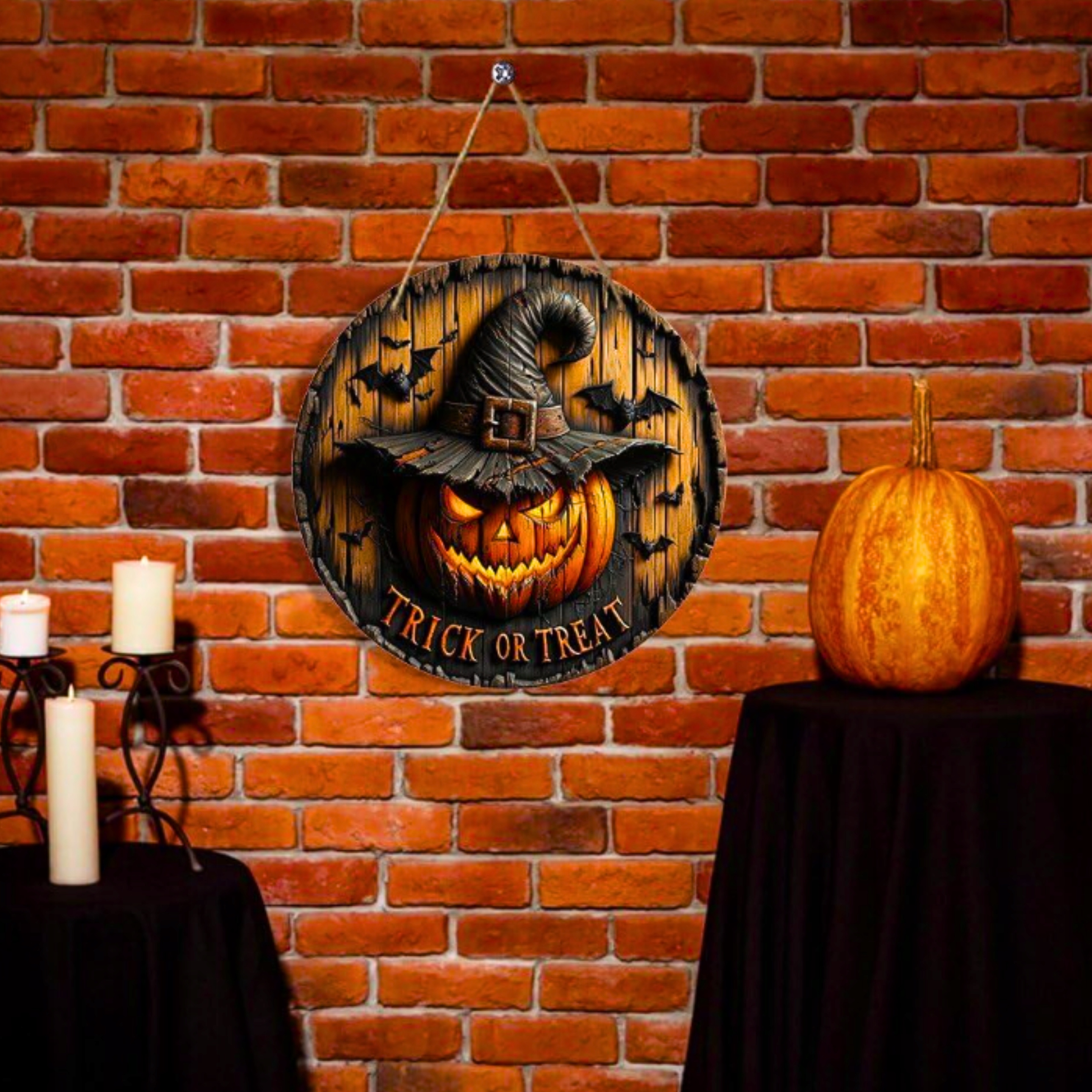 - Colors: Rustic wood, orange pumpkin, black hat, the inscription "TRICK OR TREAT"