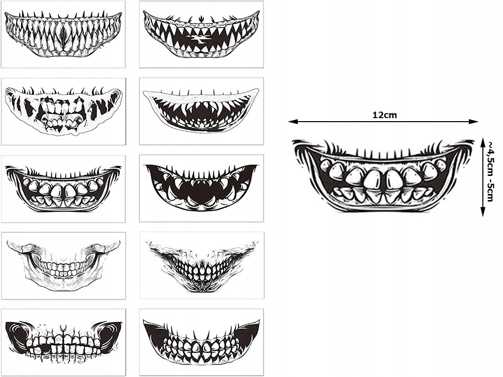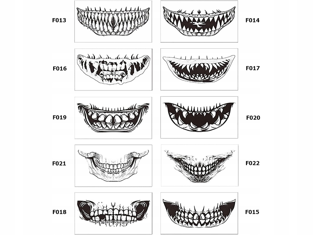 Для еще более устрашающего эффекта вы можете совместить нашу искусственную татуировку с креативным макияжем. Вот несколько идей, как подчеркнуть вид чудовищных зубов:
