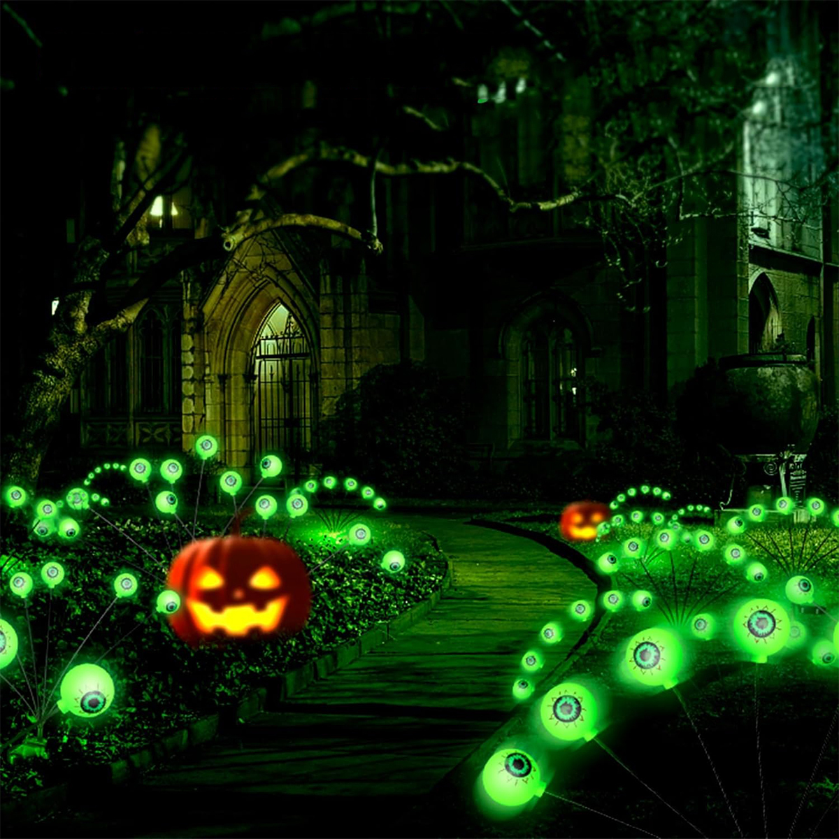 Набор из 2 садовых фонарей на Хэллоуин, 6 садовых светодиодных фонарей с зеленым глазным яблоком, 6 светодиодных светильников, подвесных на голову, светящихся садовых фонарей на Хэллоуин, требуются 3 батарейки АА (не входят в комплект)