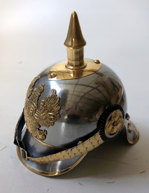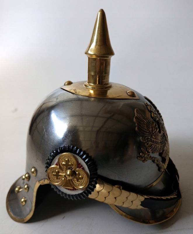 Он был импортирован из Бельгии и представляет собой замечательную копию прусского шлема, необходимого во время боевых действий.