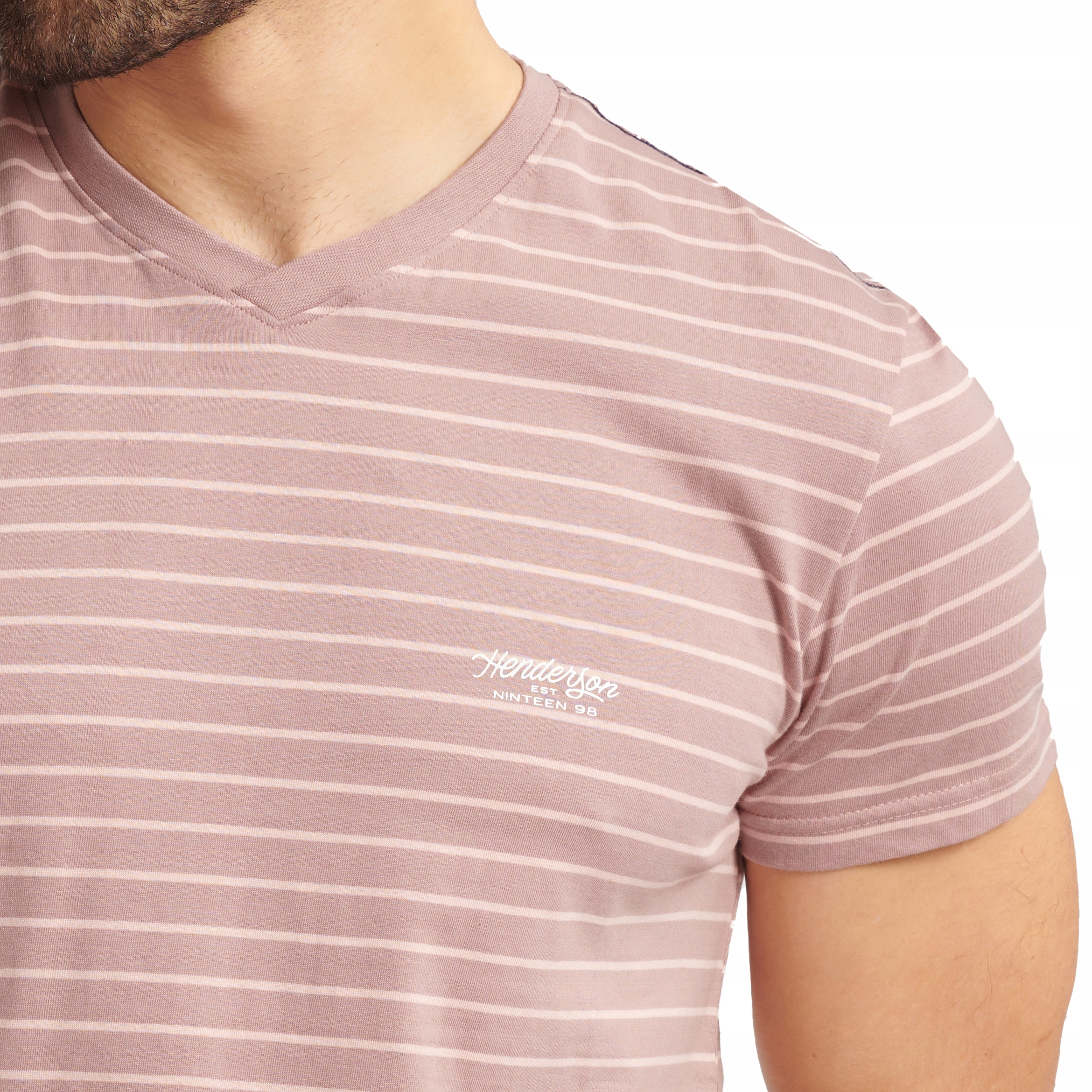 Розовая футболка в модные полоски имеет классический V-образный вырез, небольшую надпись на груди и с короткими рукавами.