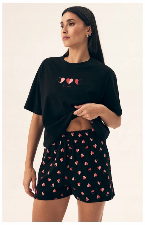 Релаксационный черный цвет покрыт очаровательным рисунком розовых сердец, который гармонизируется с печати на T -мала.