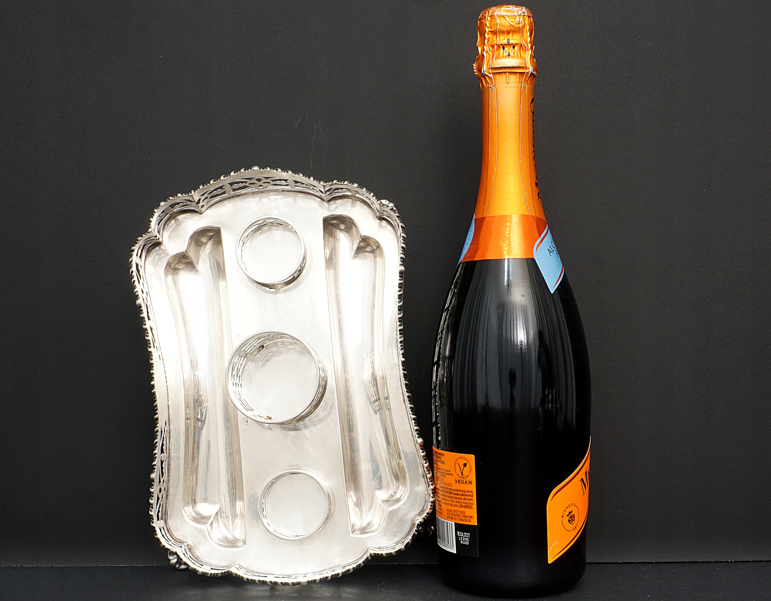 Вес нетто серебра 610 грамм плюс фурнитура для бутылок.