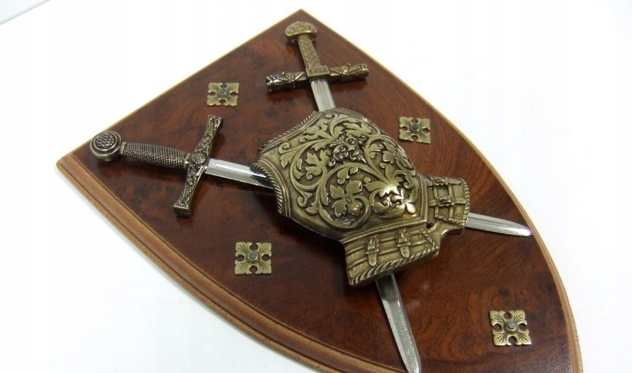 Паноплиа из фанеры, имитирующей дерево, в форме средневекового герба, с прикрепленной металлической копией декоративного нагрудника. к этому. Все это дополняется двумя пересекающимися миниатюрами мечей, проходящих через центр нагрудника, стилизованных под Экскалибур и меч Карла Великого. Броня дополнительно украшена четырьмя символами. Карл Великий был королем франков и лангобардов, а с 25 декабря 800 г. — римским императором. Он был самым выдающимся правителем средневековой Европы. В период правления Карла Великого деление мира на римский и варварский сменилось разделением на христианский (цивилизованный) и языческий (варварский) мир. Экскалибур, что в переводе означает «меч света», — легендарный меч, полученный королем Артуром после того, как он сломал Каменный Меч у Владычицы Озера. Меч должен был быть вечным, а его ножны обладали тем свойством, что носившему его человеку не грозили никакие раны. Оба меча можно вытащить, хотя бы для того, чтобы их получше рассмотреть!