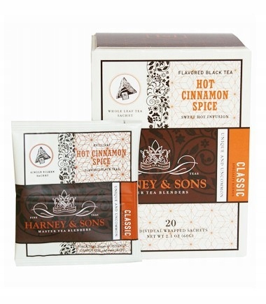 Horne & Sons Hot Cinnamon Spice - очень согревающая и естественная сладкая смесь черных чаев. его определенный вкус создается путем добавления апельсиновой коры , гвоздики и три типа корицы . Это самый известный и самый узнаваемый чай Harney & Sons. (Горячая коричная специя и горячий закат с корицей - это тот же чай, название отличается только в некоторых пакетах.) Чай содержит кофеин и является кошерным.