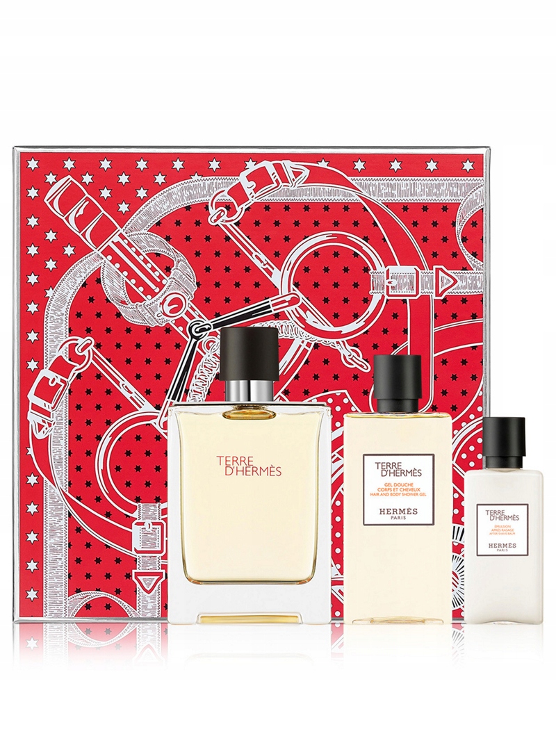В восхитительный набор ароматов Hermes Terre D'Hermes входит флакон туалетной воды объемом 100 мл, гель для душа 80 мл и гель для душа 40 мл. после бритья.