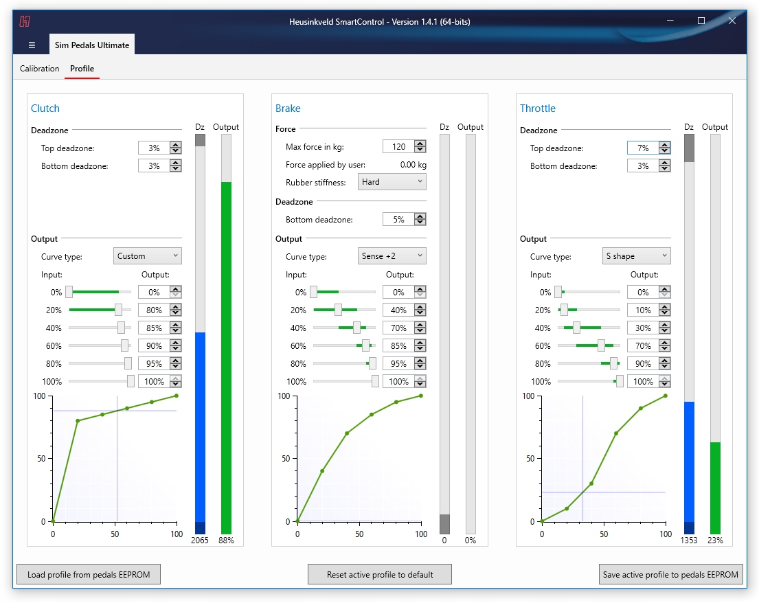 Heusinkveld Ultimate+ поставляется с мощным инструментом настройки, который позволяет настраивать педали способами, которые раньше были невозможны. Работая с нашей собственной электронной платформой, SmartControl позволяет мгновенно отображать (нелинейные) кривые мощности педали, мертвые зоны педали и усилие на педали тормоза.