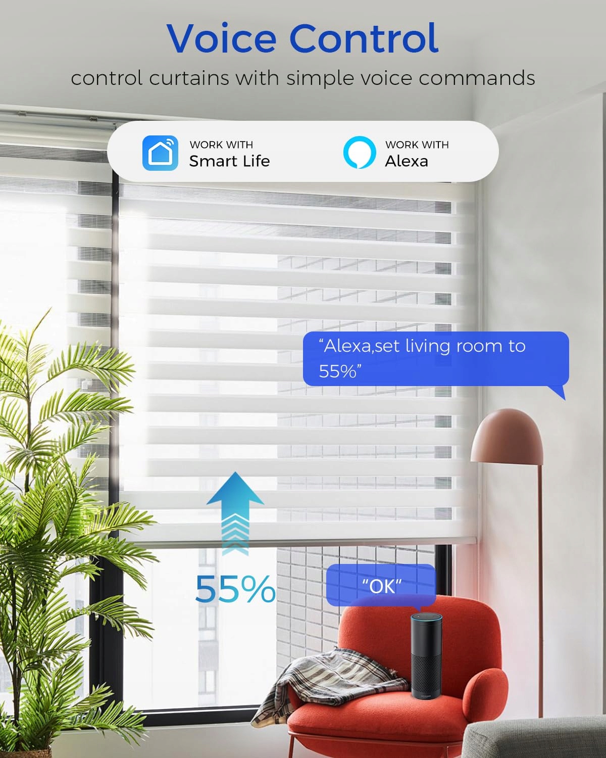 - Голосовое управление: переключатель рольставен совместим с переключателями рольставней Alexa и Google Home. Используйте голосовую команду «Alexa, открой/закрой роликовую дверь на 55%». Выключатель жалюзи Alexa