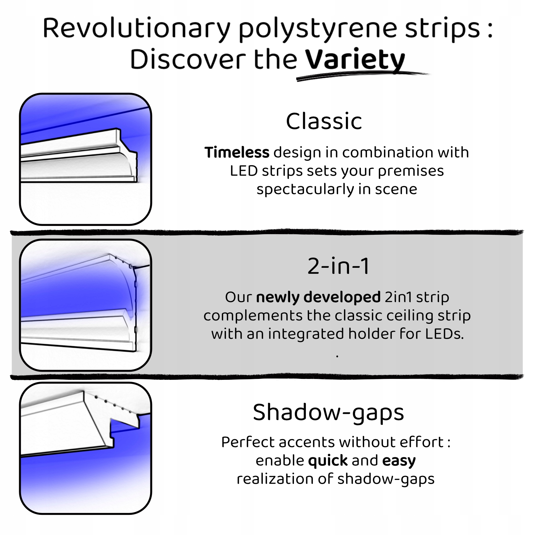 Полоски из белоснежного экструдированного полистирола просты в обработке и легки, что делает их точными и простыми в установке для каждого любителя DIY. Долговечность материала гарантируется его высокой прочностью и устойчивостью к легким ударам. При этом материал остается пожаробезопасным и влагостойким, что позволяет проводить монтаж во влажных помещениях и подвалах.