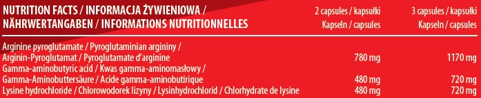 Состав: аргинина пироглутамат, гамма-аминомасляная кислота, лизина гидрохлорид, капсула (желатин), антислеживатель: магниевые соли жирных кислот.