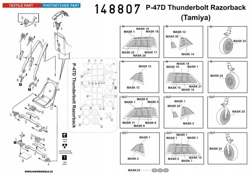 Набор вырезанных лазером комплектных полос и маска для покраски кабины пластиковой модели P-47D Thunderbolt Razorback - Tamiya. Ремни изготовлены из настоящего материала (микроволокна), а пряжки — из фототравленных элементов. Масштаб 1/48