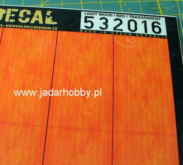 Лист формата А5 содержит 10 сегментов декалей под дерево размером 60 х 32 мм. Этот тип прозрачен, поэтому вы можете регулировать окончательный оттенок наклейки с помощью основного цвета. Структура древесины соответствует масштабу 1/32.