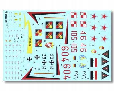 <р>1. Красная 46,Советская А.Ф. Гвардейский полк, 1990 г.; <р>2. Черный 29060, ВВС Ирака, 1991 г.; <р>3. Красный 105-й полк 1-го пехотного полка, ВВС Польши, 1991 г.; <р>4. Красный 604, 3-е авиационное крыло, ВВС Восточной Германии 1990 г. со схемой «Последний полет»; <р>5. 29+14, Немецкий А.Ф. 1991.Размер: 9 см x 12 см.