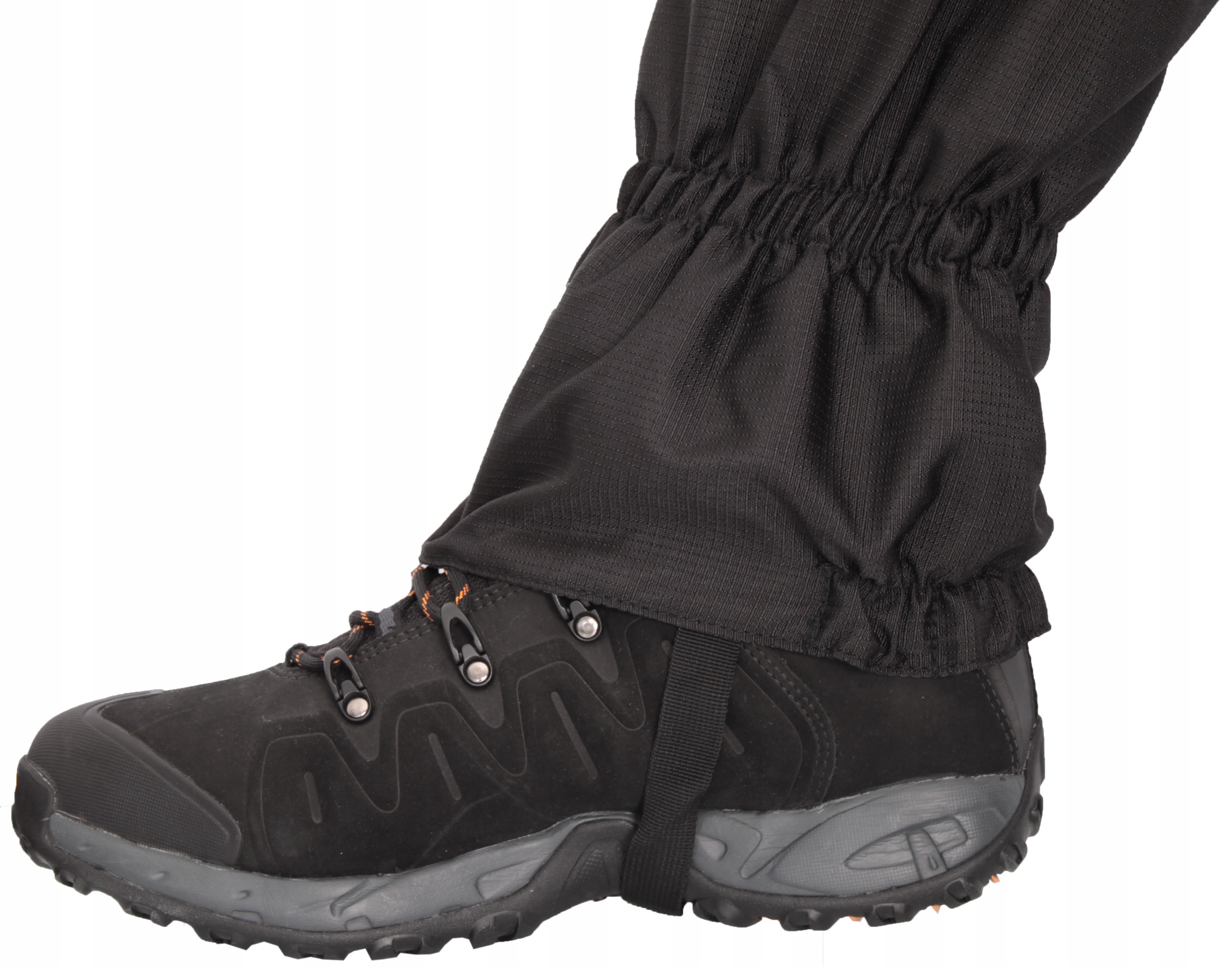 Сверху: полоска, предотвращающая расползание молнии и намокание. Эластичная лента со стопором подстраивает протектор под толщину икры.