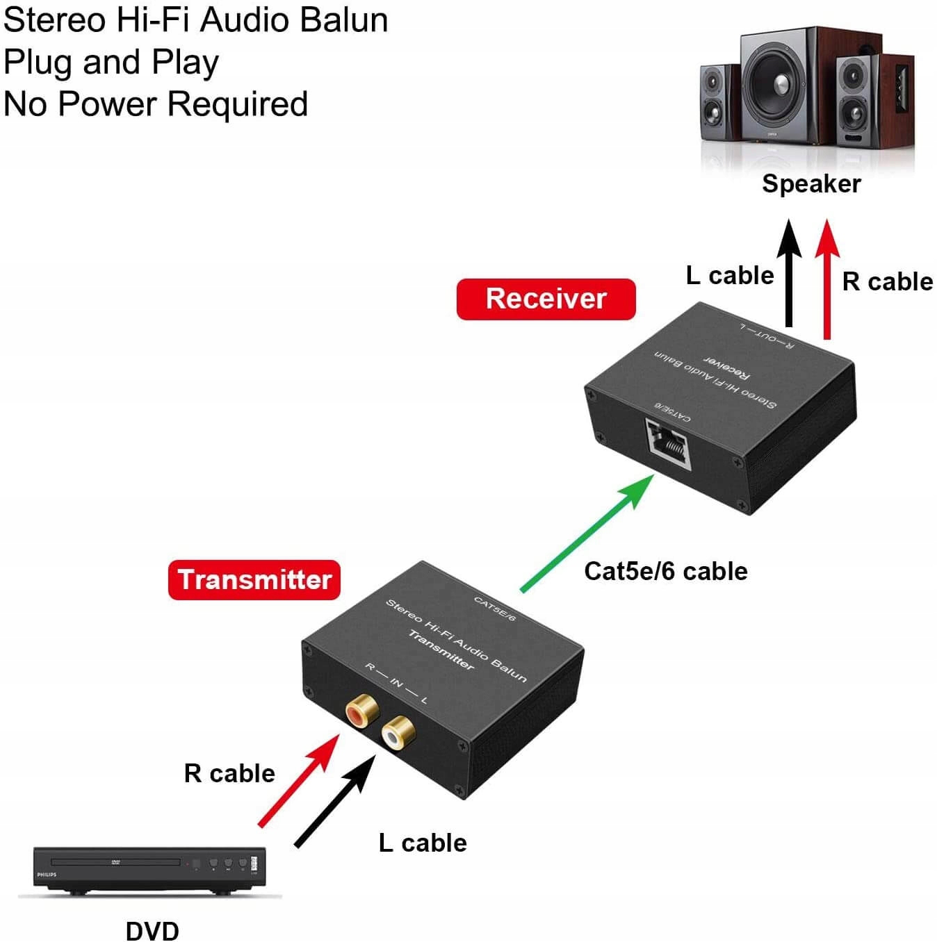Устройство работает по принципу Plug & Play. Просто подключите источник звука к передатчику с помощью кабеля R/L, затем подключите аудиосистему к балунному приемнику с помощью кабеля R/L. Последним шагом будет подключение передатчика к приемнику с помощью кабеля локальной сети.