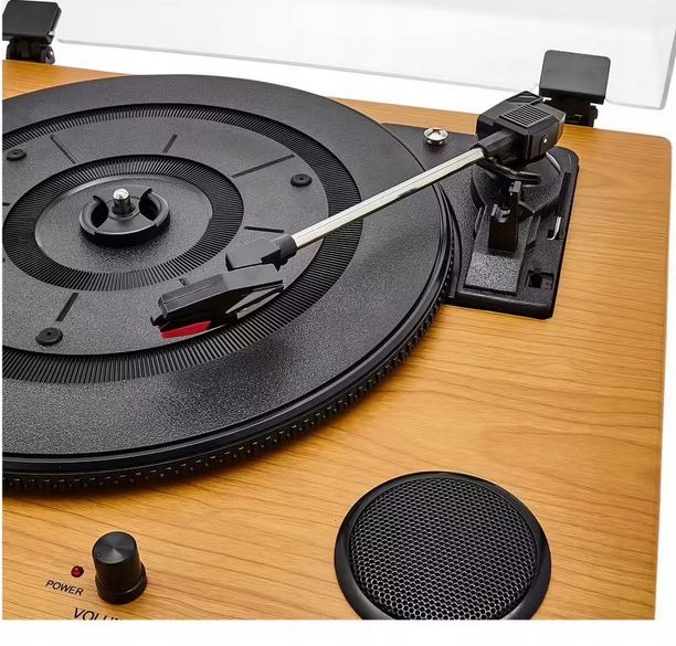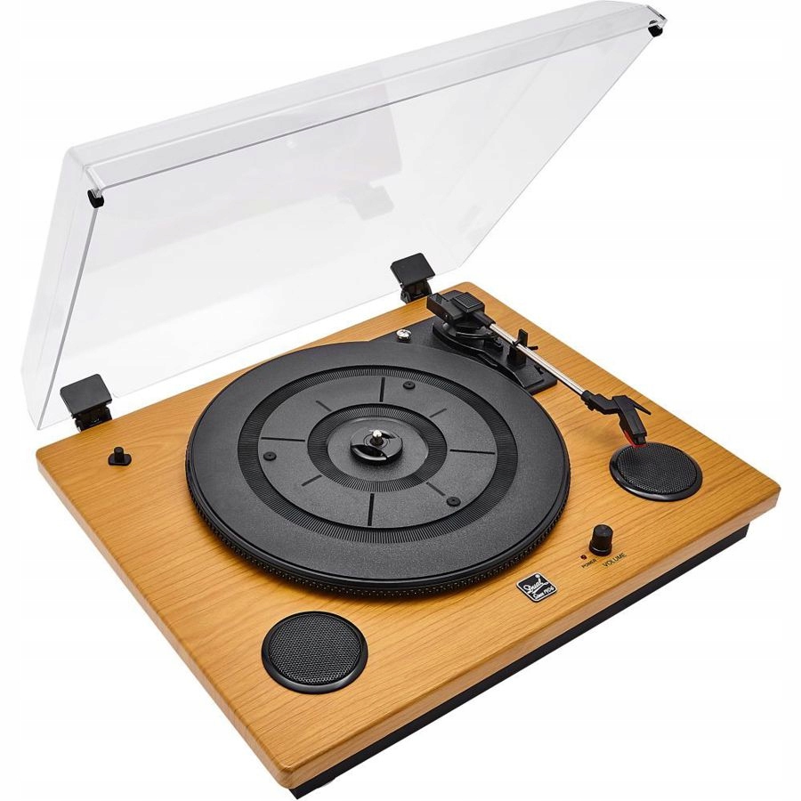 - Портативная конструкция со встроенными динамиками позволяет без проблем транспортировать и хранить проигрыватель.