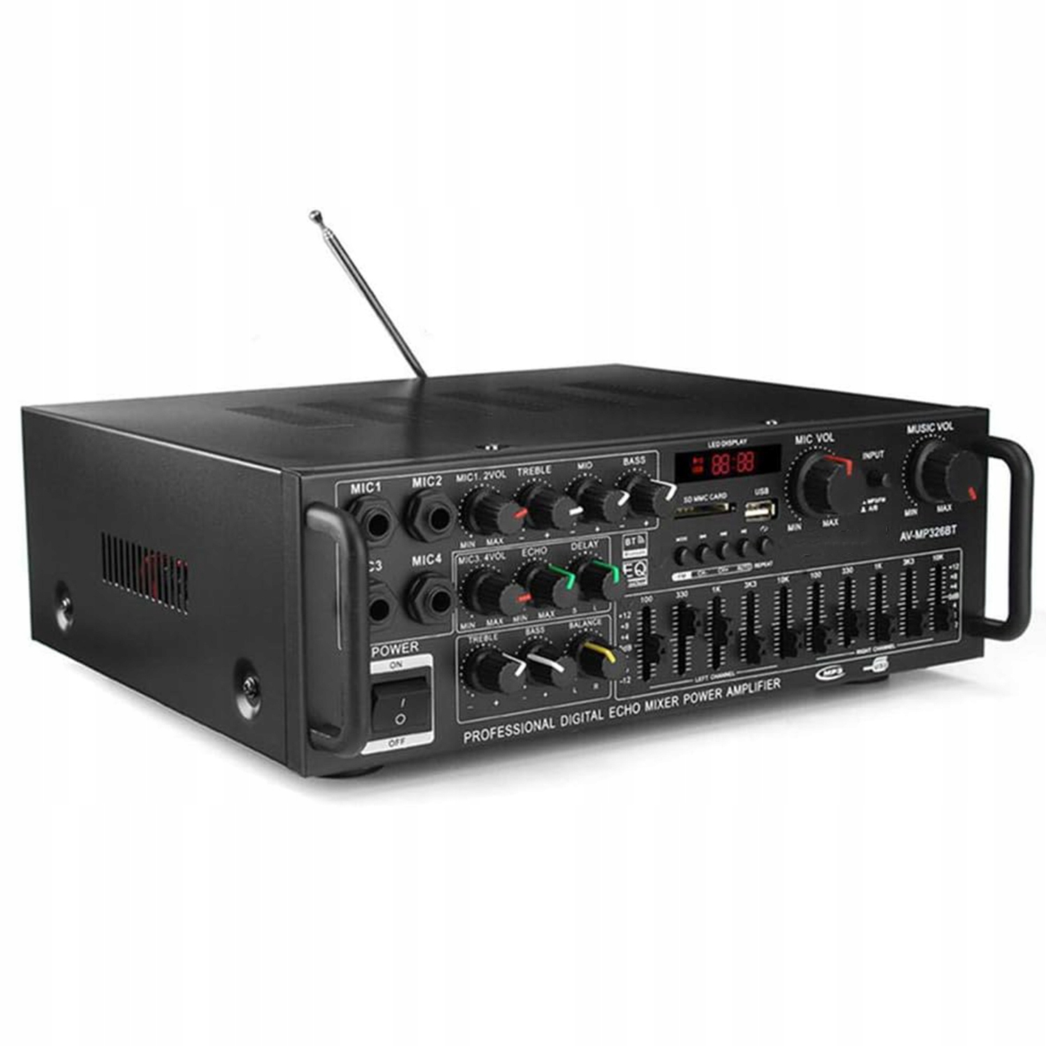 С Bluetooth 5.0, FM-радио, светодиодным дисплеем, входом постоянного тока 12 В, 4 микрофонными входами, регулировкой реверберации и задержки микрофона и функцией 5-полосного микшера. эквалайзер.