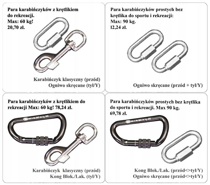 В базовом исполнении плечи амортизированных веревок заканчиваются петельками (без карабинов). Из-за количества комбинаций пользователь выбирает их типы отдельно. Однако, чтобы было проще, в предложении «Аллегро» мы предлагаем готовые наборы с наиболее часто используемыми формами концовок, которые используются как в спорте, так и на отдыхе – они доступны непосредственно в наборах этого предложения в разделе . Раздел «Купить вместе»: