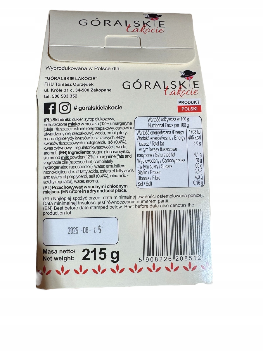 Ингредиенты: сахар, глюкозный сироп, обезжиренное молоко в порошке (12%), маргарин [масла и овощные жиры (рапсовое масло, полностью затвердевшее масла рапса), водяные эмульгаторы: монодиглицериды жирных кислот, жирные кислоты и полиглицерильные эфиры, соль (0,4%), регулятор кислот, водосточные кислоты, арома.