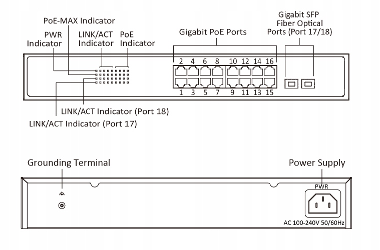 - Порты: 16x гигабитные порты POE, 2x волоконно -оптические порты Gigabit SFP