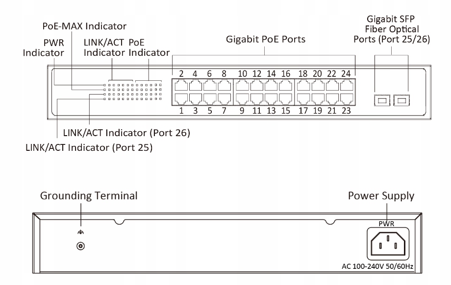 - 24 гигабитных порта PoE и 2 гигабитных оптоволоконных порта.