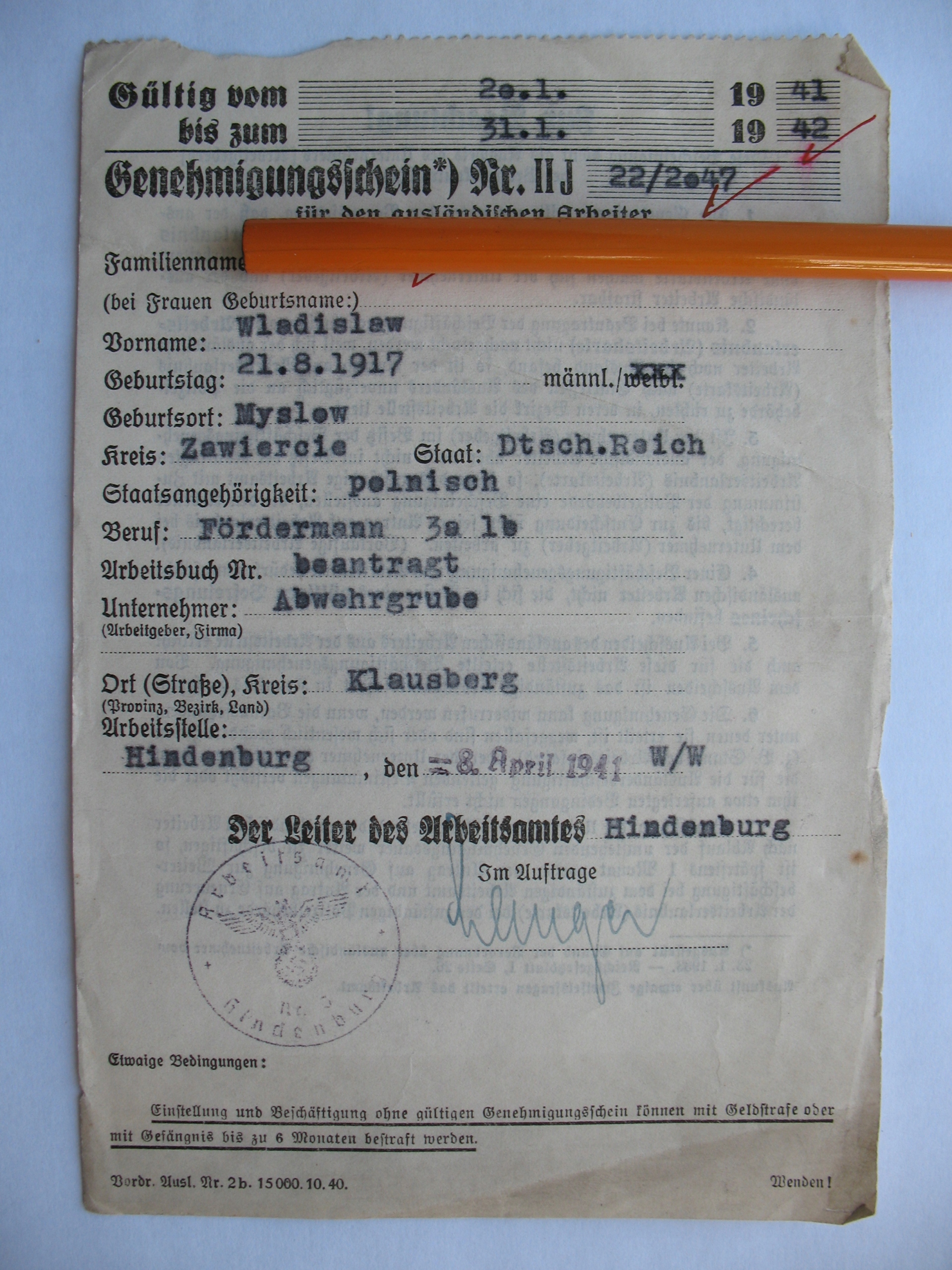ГИНДЕНБУРГ-ЗАБЖЕ МИСЛОВ-ЗАВЕРЦЕ РАЗРЕШЕНИЕ НА РАБОТУ 1941 г.