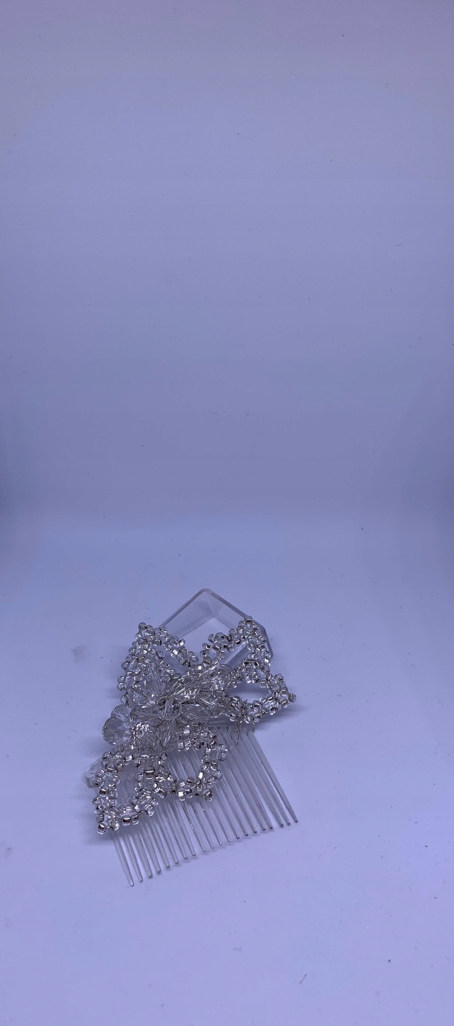 - Цвет: Структура из серебра проволока, богато украшенная мелкими серебряными или прозрачными бусинами и более крупными прозрачными ограненными кристаллами, красиво отражающими свет. Крепежная гребенка прозрачная.