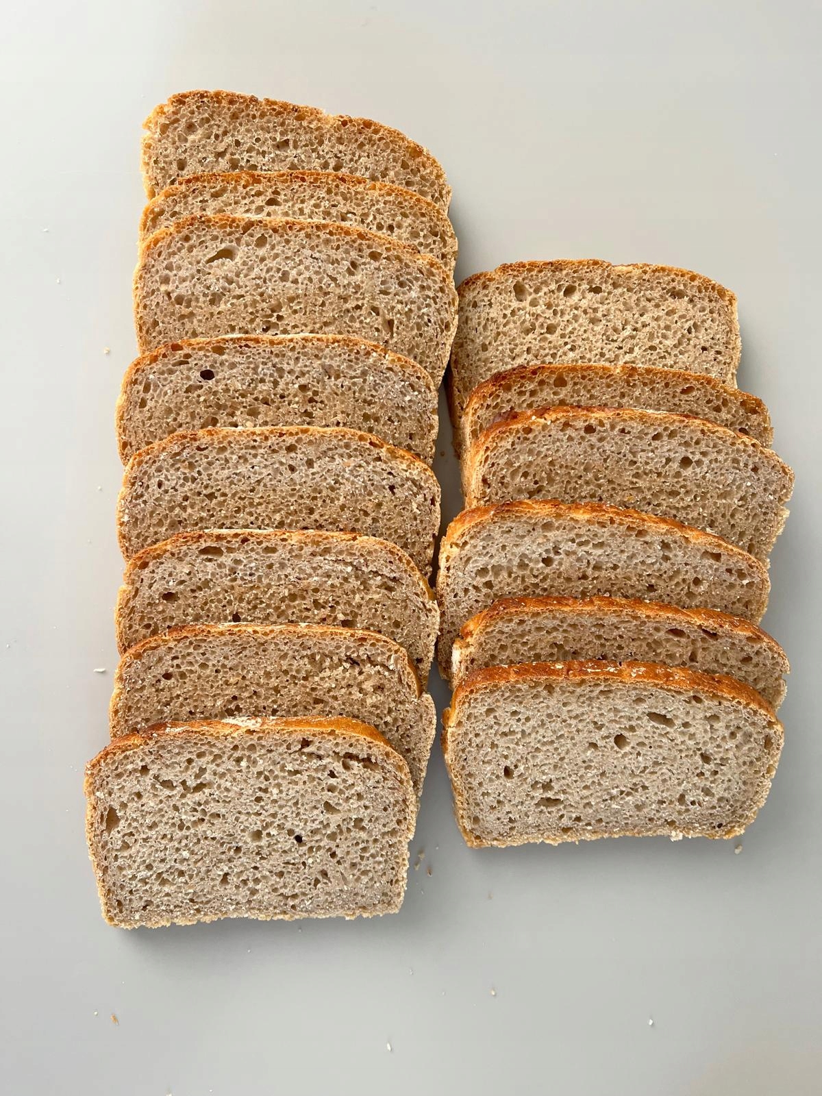 100% живая пшенично-ржаная закваска: Мы уже много лет используем нашу закваску, кормя ее лучшей мукой. Он отвечает за неповторимый, слегка кисловатый вкус, влажность и естественную долговечность хлеба.