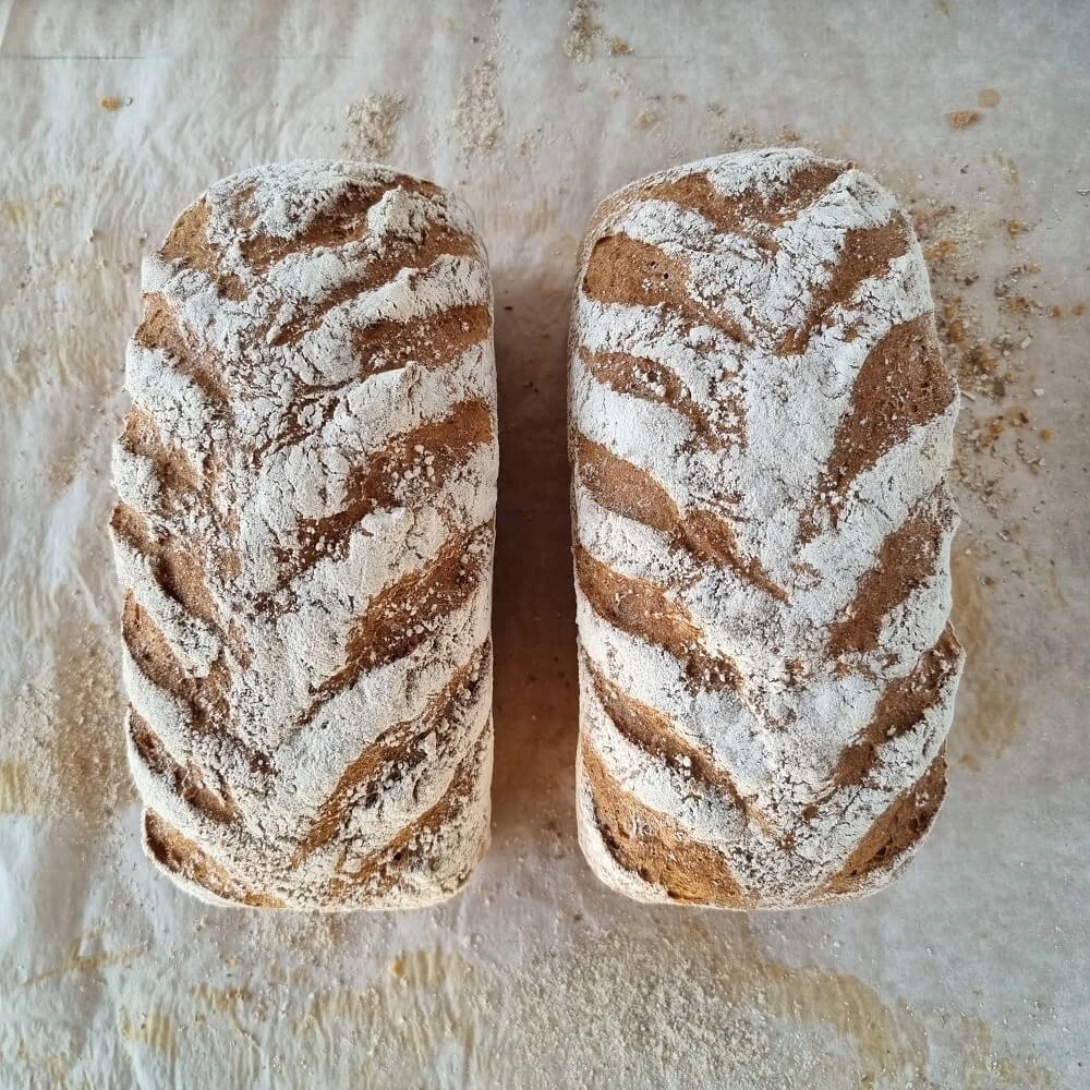 Хлеб из полбы мы готовим из... муки из полбы. Мы подчеркиваем это, потому что в магазинах можно найти хлеб из полбы, который так называется только потому, что содержит 20-30% муки из полбы. У нас есть настоящий хлеб из полбы. Никакой ерунды.