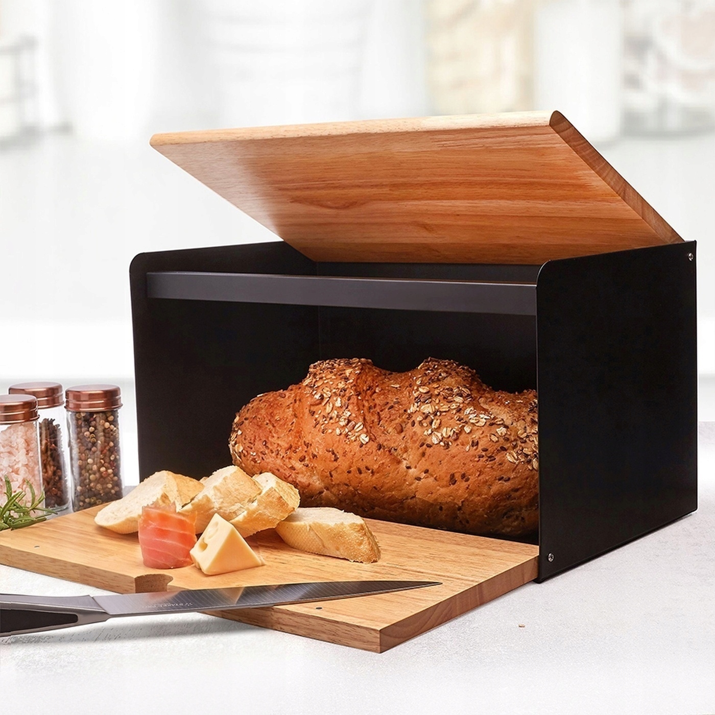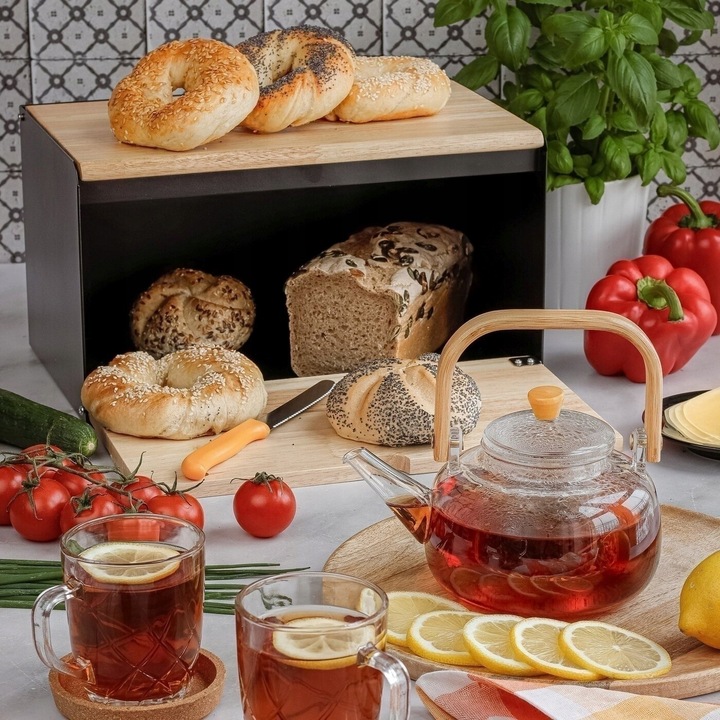Две деревянные доски и стальной корпус очень стильно смотрятся в интерьере. В разложенном виде нижнюю доску можно использовать как разделочную доску. Плотно закрывающаяся застежка защищает и позволяет дольше наслаждаться свежестью хлеба.