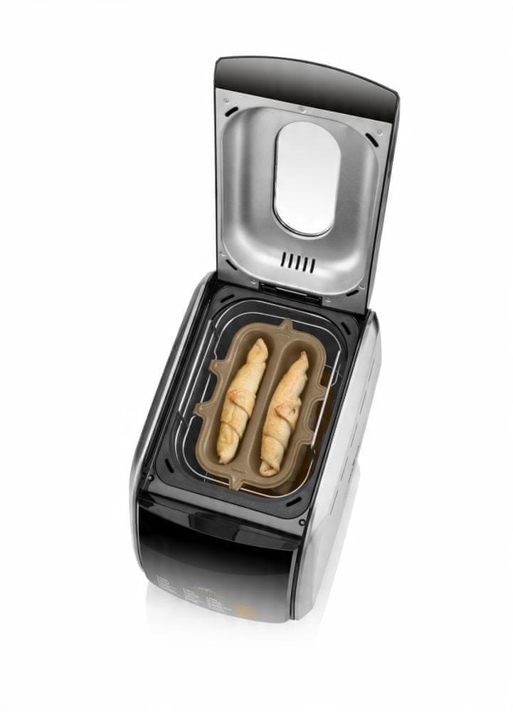 Комплексный набор, с помощью которого можно приготовить: хлеб, пирожные, безглютеновый хлеб, круассаны, булочки, кексы, соленья, джемы и йогурты< /б> . В комплект хлебопечки входит множество аксессуаров, таких как формы с антипригарным покрытием и подставка для форм.