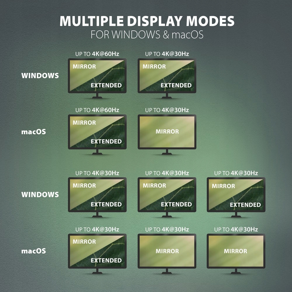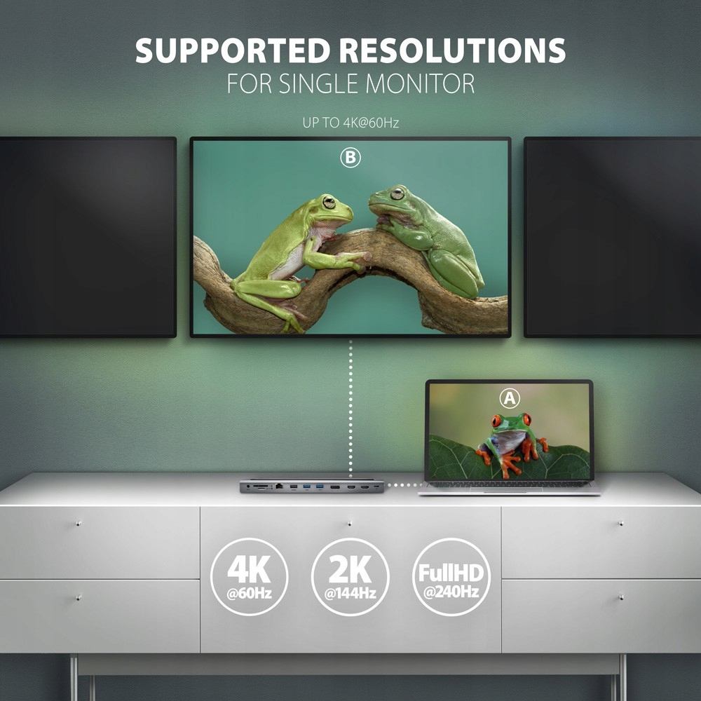 Каждый из трех видеовыходов (2x HDMI + 1x DisplayPort) обеспечивает высококачественное изображение в разрешение до 4K/60 Гц Ultra HD. Поддерживает высокие частоты в популярных игровых разрешениях 2K/144 Гц или FullHD/240 Гц. Даже при одновременном подключении трех мониторов док-станция может обеспечить разрешение до 4K/30 Гц на каждом из них. Благодаря поддержке HDR (расширенный динамический диапазон) вы можете наслаждаться значительно расширенным диапазоном цветов и контрастов без ограничений. Для правильной работы видеовыхода требуется порт USB-C или Thunderbolt 3/4 с включенным DisplayPort (DP Alt Mode). Поддержка вышеуказанного макс. поддерживаемые разрешения и частоты требуют подключения к компьютеру с DisplayPort версии 1.4.