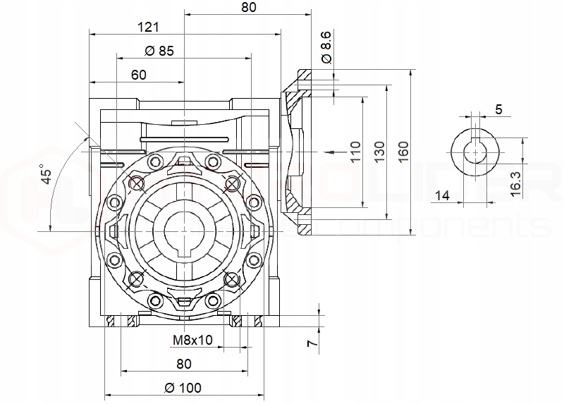 Редуктор HMRV 50 предназначен для снижения выходной частоты вращения в 1- и 3-фазных электродвигателях с механическим типоразмером IEC71, оснащенных фланцем В5 наружным диаметром 160 мм.