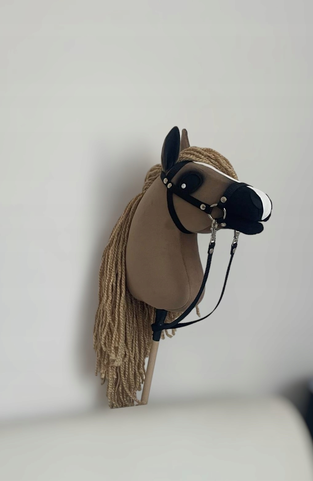 Сшит на машине, вся отделка выполнена вручную. Крепится на буковую опору высотой 30 см. У него плотно пришита грива из пряжи, ноздри из фетра, набит силиконовый шарик. Лошадь заштрихована вручную, нарисовала уши, мордочку и глаза. Все материалы, использованные при создании Hobby Horsa, а также краски сертифицированы как безопасные для детей.