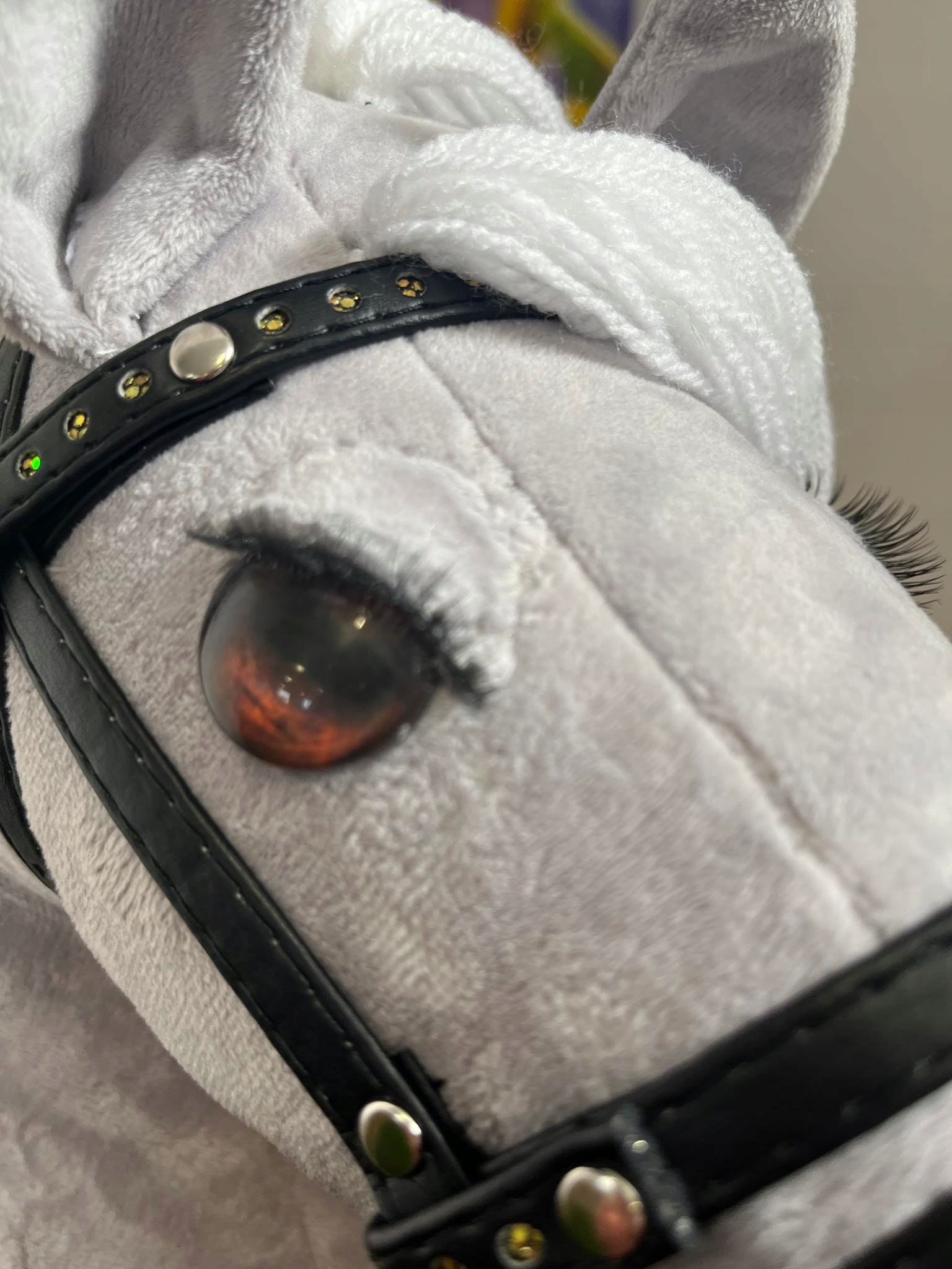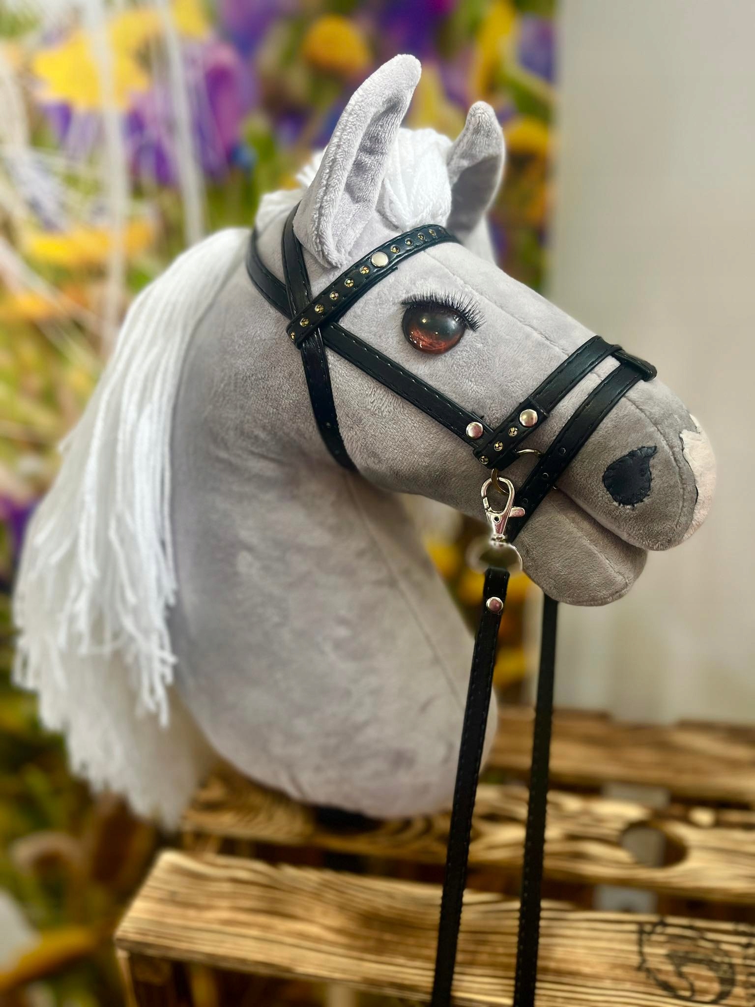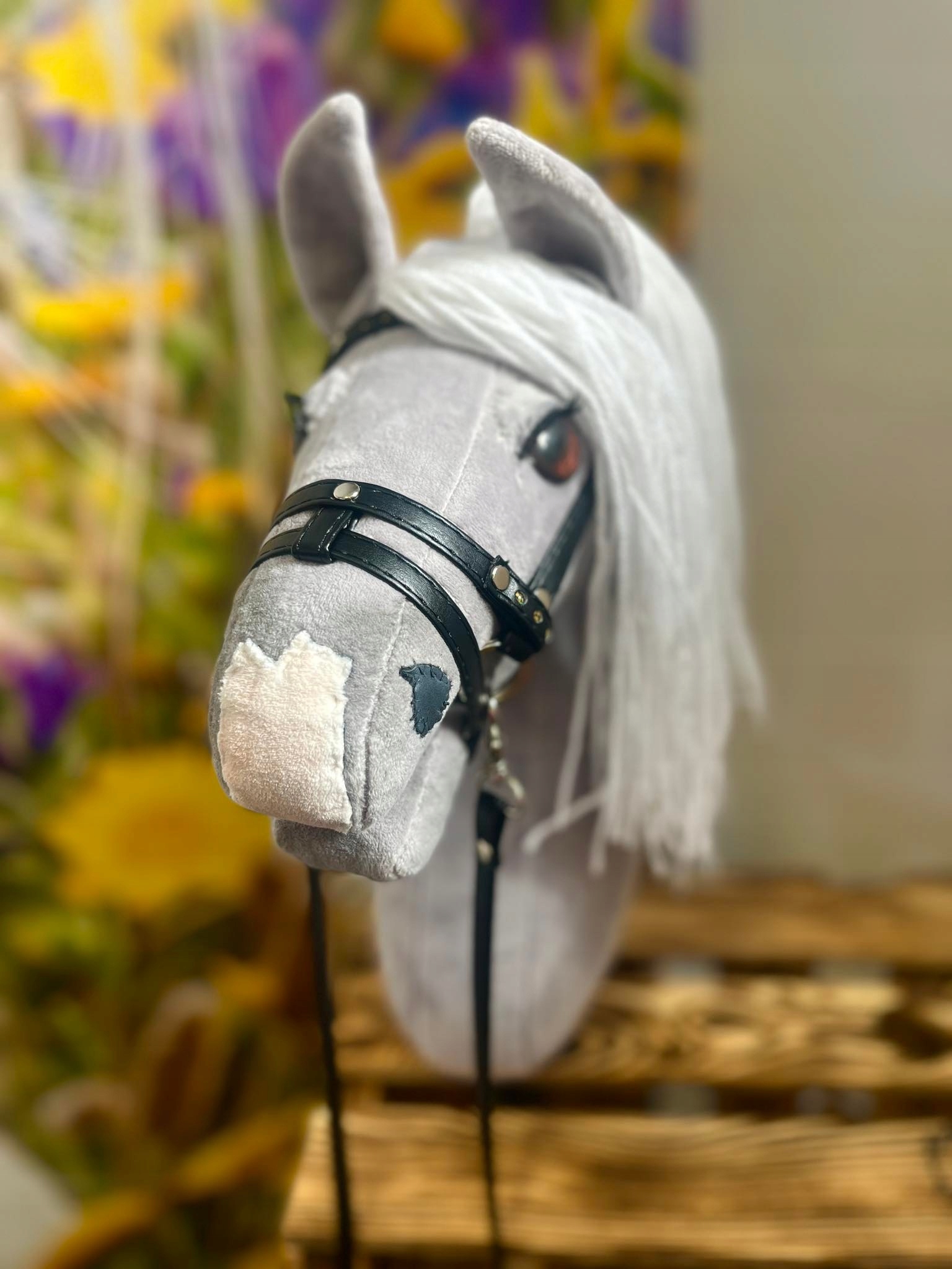 Лошадь формата А3, очень красивой формы, изготовлена из норкии и набита силиконовым шариком. Установлен на палке из массива бука, полностью сшит вручную с вниманием к деталям. Глаза и длинная белая грива привлекают внимание.