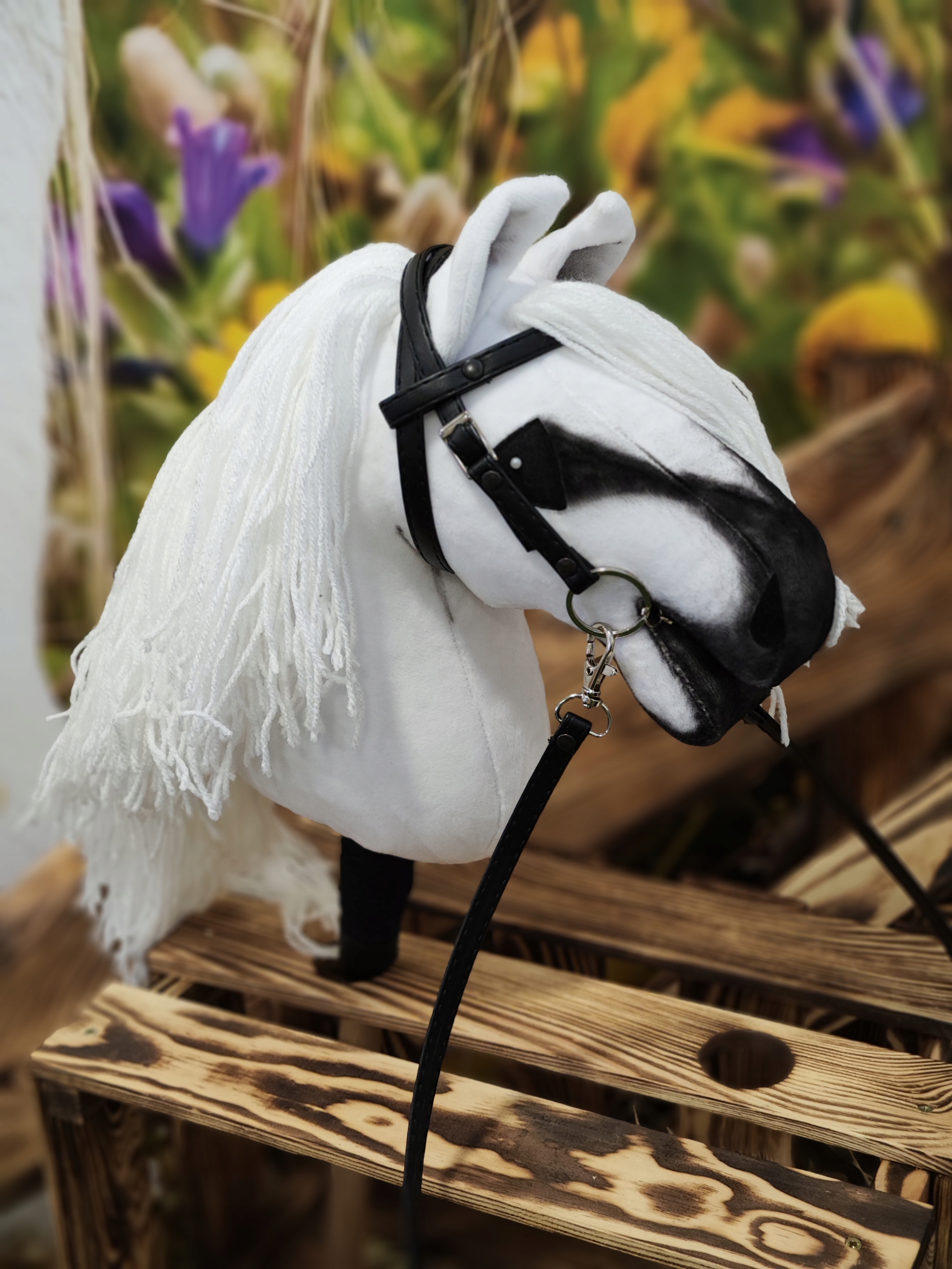 Лошадь из мягкогоноркового материала, набитая силиконовым шариком. Насажена на короткую деревянную палочку, сшита на машине, грива выполнена из пряжи.