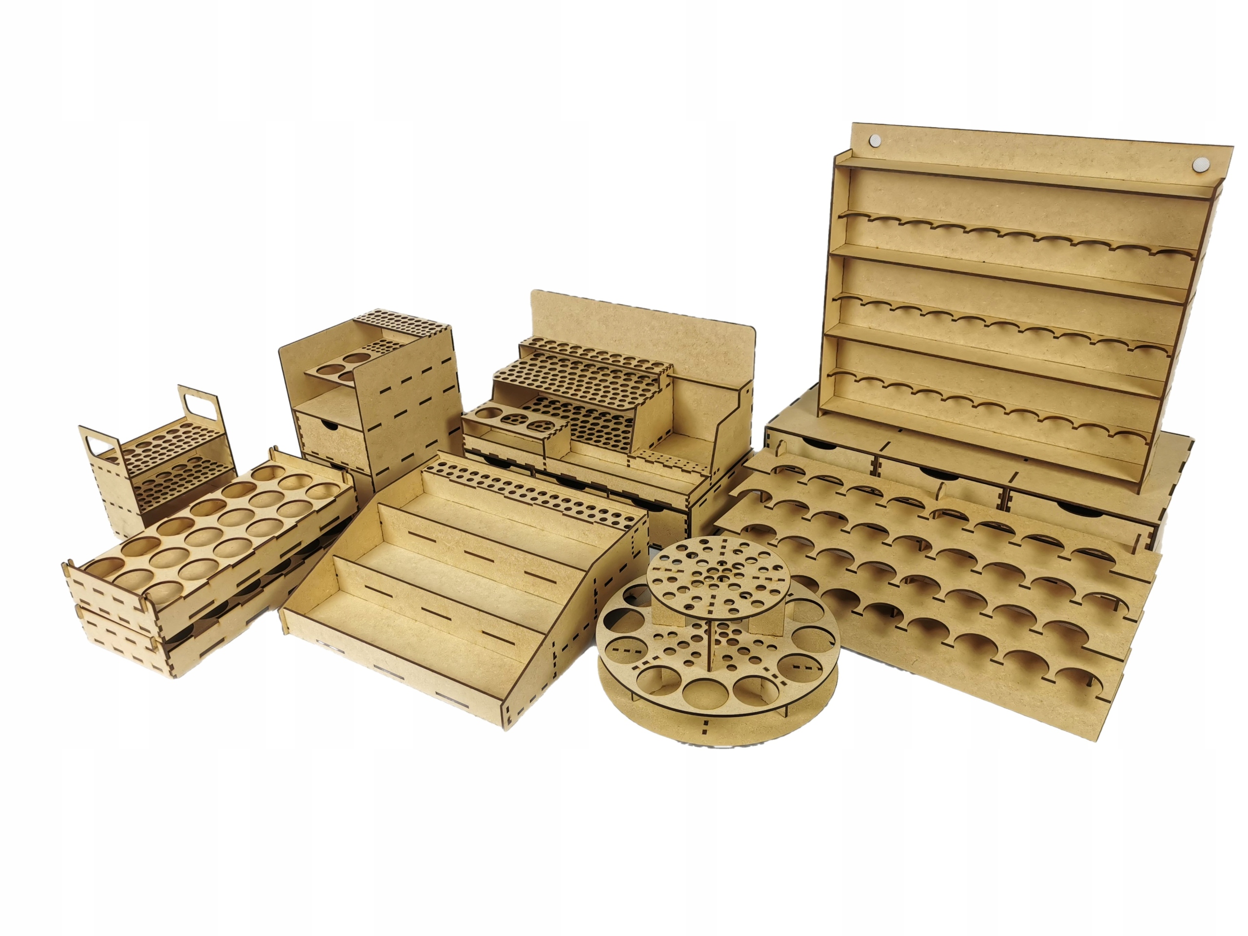 При проектировании стенда мы позаботились о том, чтобы он был максимально вместительным, но при этом занимал как можно меньше места. Продуманное расположение и соответствующий угол наклона полок означает, что 24 места диаметром 41 мм могут вместить большую коллекцию красок, таких как: для красок: Humbrol 28 мл, Tamiya 23 мл и занимающих всего 17,5 х 11,5 см стола.