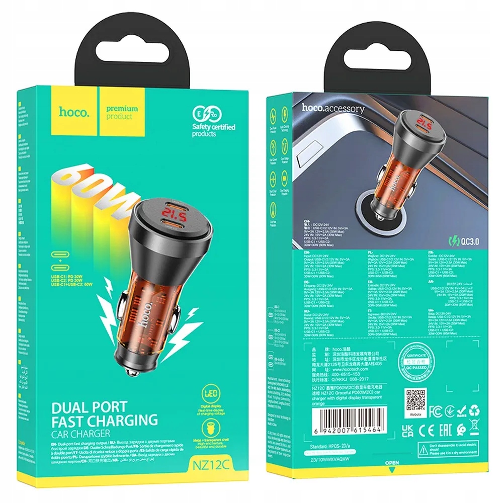 Hoco Car Charger 2 x Тип C 30 Вт с PD60W NZ12C транспортный дисплей