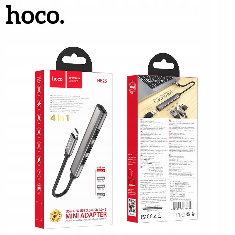 hoco. HB26 4in1 — универсальный USB-концентратор, оснащенный входным портом USB Type-C и четырьмя портами USB, одним портом USB 3.0 и тремя портами USB 2.0. Хаб поддерживает устройства с максимальной емкостью 1 ТБ.