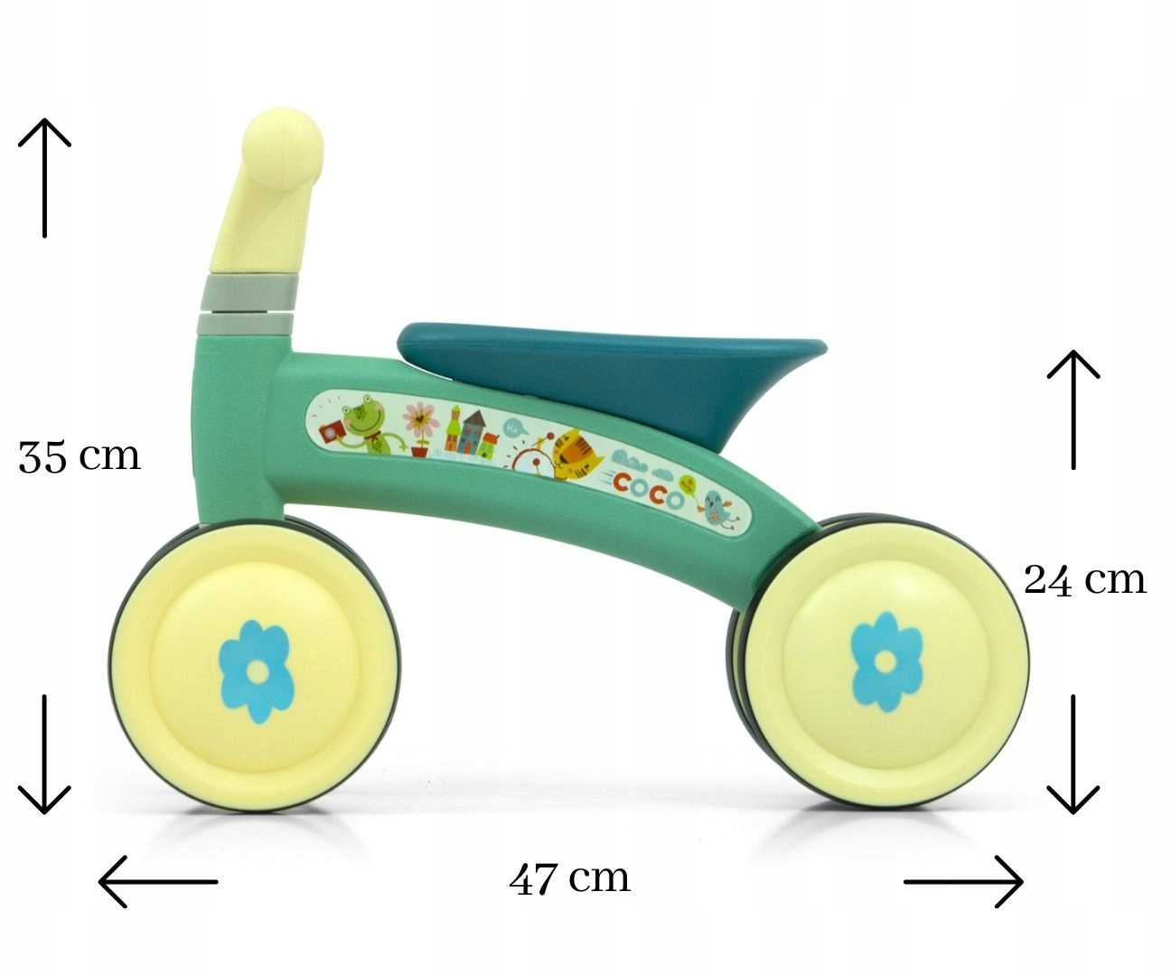 Велосипед COCO — идеальное решение для детей, которые только учатся кататься на велосипеде и еще не умеют балансировать на двух колесах, но хотят передвигаться самостоятельно. . Четыре колеса обеспечивают исключительную стабильность, безопасность и комфорт вождения как дома, так и на открытом воздухе, например, на тротуаре, и на освещении. > и в то же время прочная конструкция из высококачественного прочного пластика будет работать в любых условиях. Двойное заднее колесо обеспечивает большую устойчивость и в то же время легкость качения, поэтому не утомляет нашего маленького водителя. Прорезиненные покрытия колес гарантируют бесшумную работу. Ручки обеспечивают удобный захват руки ребенка, а правильно профилированное сиденье повышает комфорт и безопасность вождения. Транспортное средство имеет красочные эмблемы, побуждающие ребенка играть.