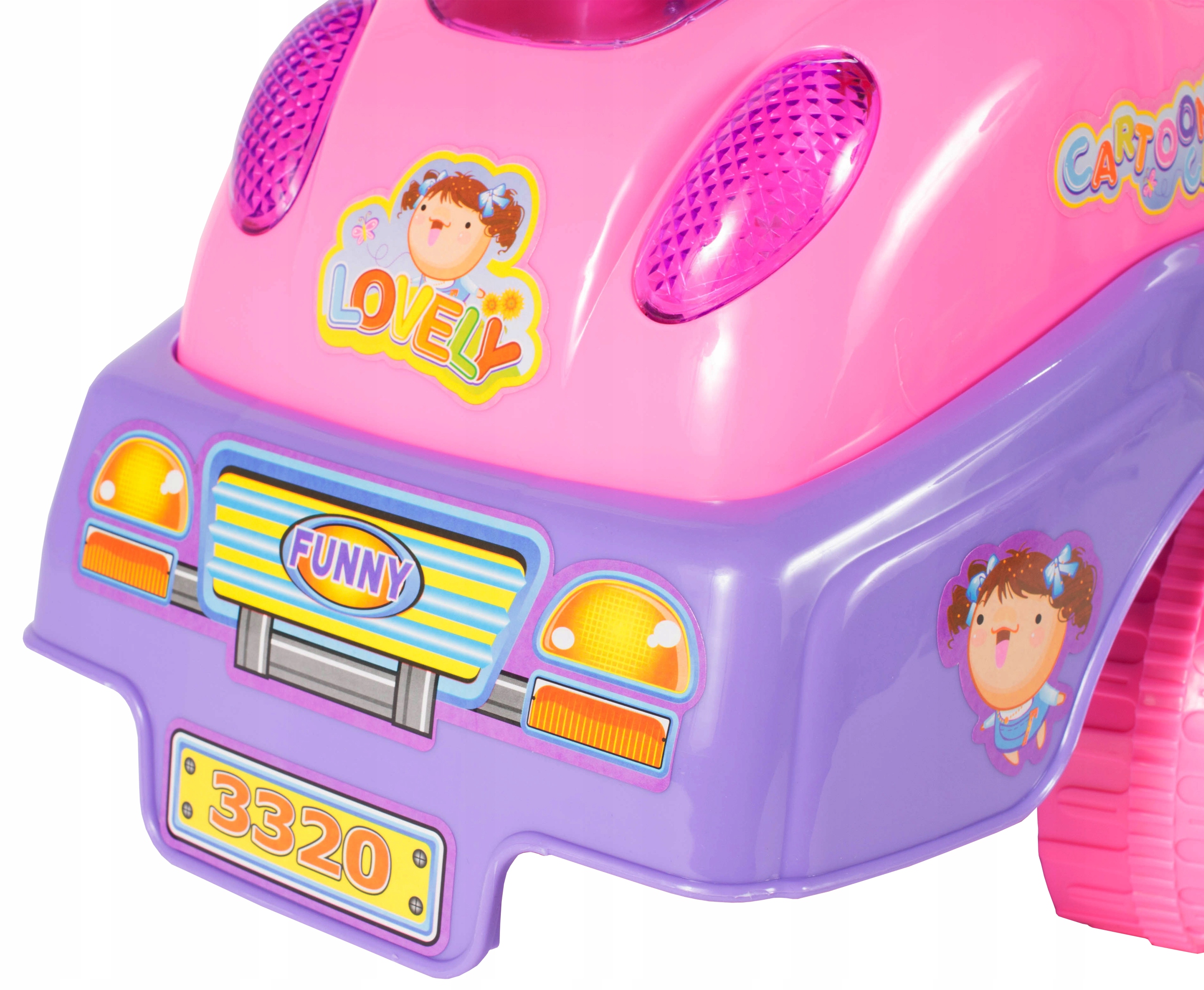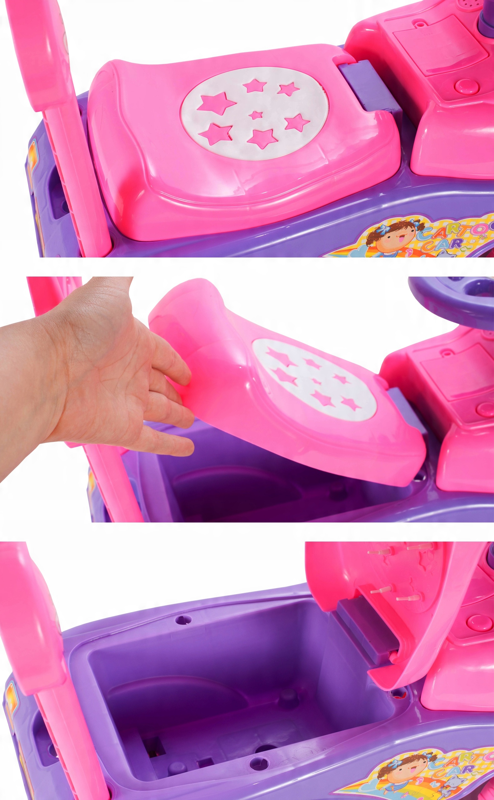 Автомобиль доставляет массу удовольствия ребенку. Он оснащен местом для хранения вещей под сиденьем, звуковым сигналом на рулевом колесе и удобным сиденьем со съемной спинкой. Кроме того, после установки батареек автокаталог воспроизводит 17 различных мелодий.