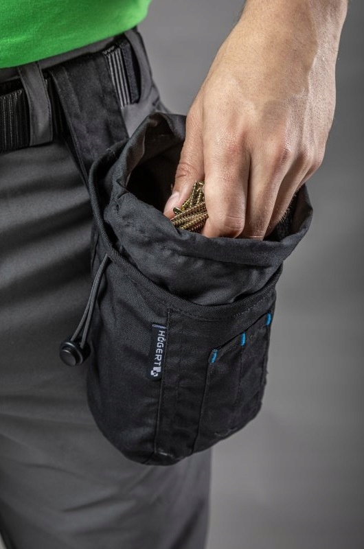 Карман для гвоздей и других мелочей из прочного материала. Он имеет одно вместительное отделение, позволяющее носить с собой большое количество аксессуаров, таких как дрели, отвертки, шурупы или гвозди. Дополнительно оснащен двумя длинными узкими карманами для ручек. Выступающий воротник со шнурком предотвращает высыпание содержимого футляра и гарантирует быстрый и легкий доступ к ногтям. Карман крепится к ремню брюк. Особенно полезен при строительных и ремонтных работах, монтажно-монтажных работах, обслуживании и ремонте машин и устройств.