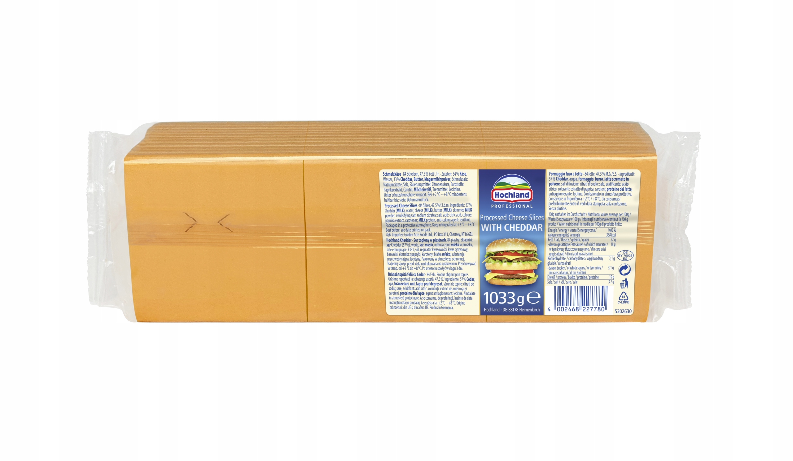 Ломтики плавленого сыра Чеддер от Hochland Professional – продукт высочайшего качества, предназначенный для гамбургеров и горячих закусок. Специальный многослойный метод упаковки делает его удобным и простым в использовании продуктом для профессионалов.