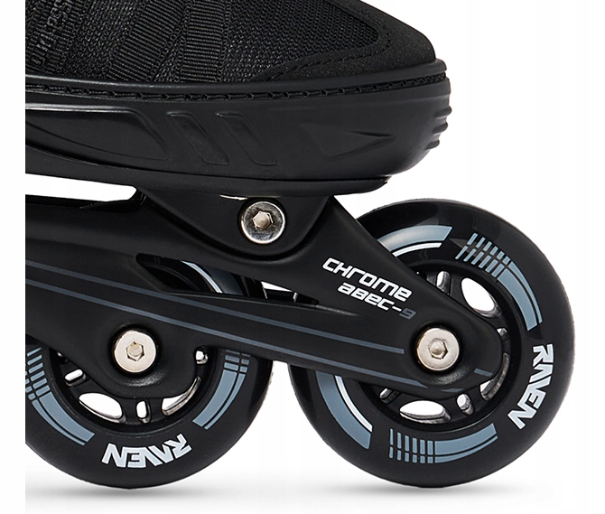 Шнурки, пряжка с зубчатым ремешком, застежка и дополнительная прижимная пряжка на язычке обеспечивают правильное затягивание и надежное удержание ноги в обуви, предотвращают смещение стопы и гарантируют безопасное катание. Защелки роликовых коньков RAVEN имеют кнопку, которая предотвращает их расстегивание во время катания. Ремешок на липучке удерживает шнурки на месте, предотвращая их случайное развязывание.