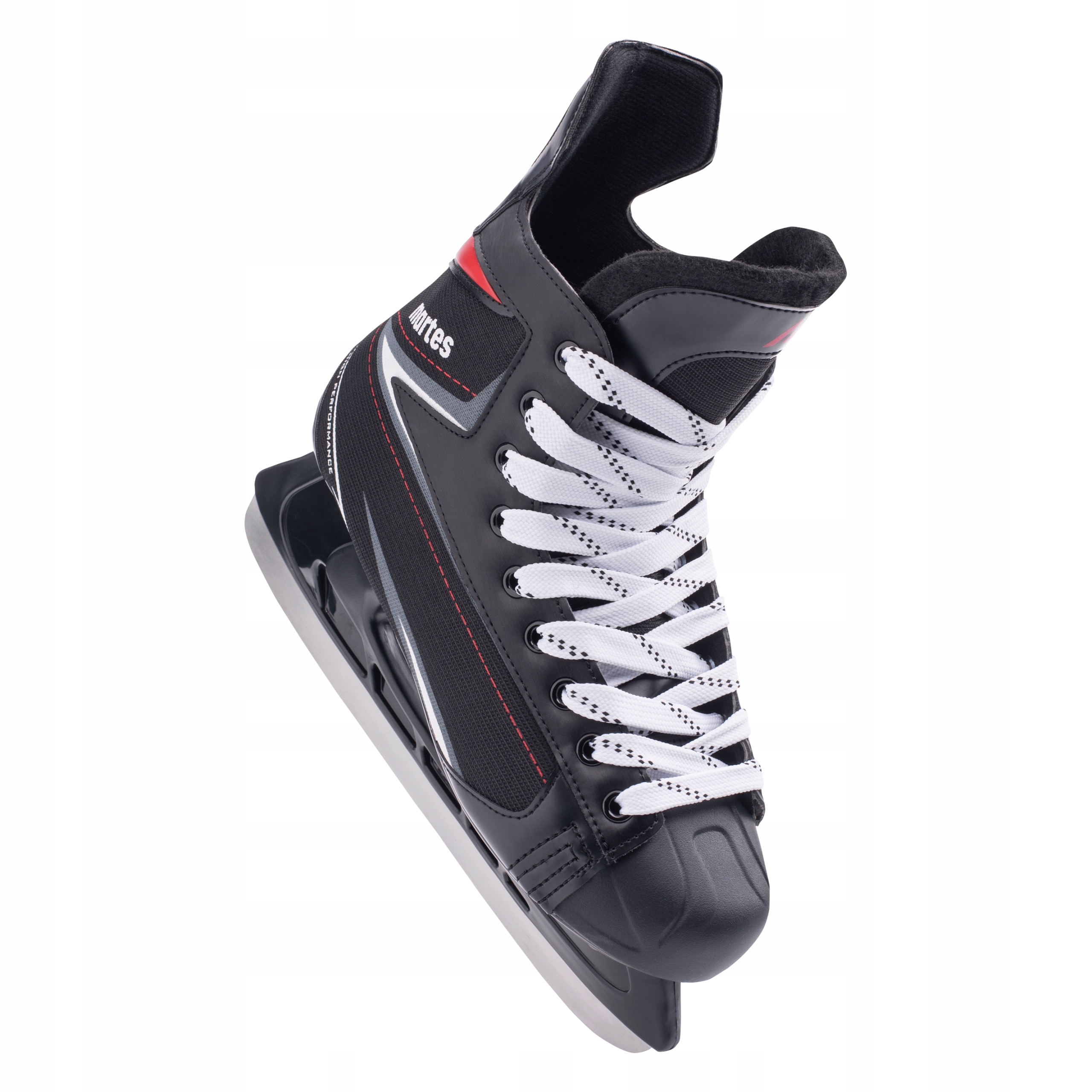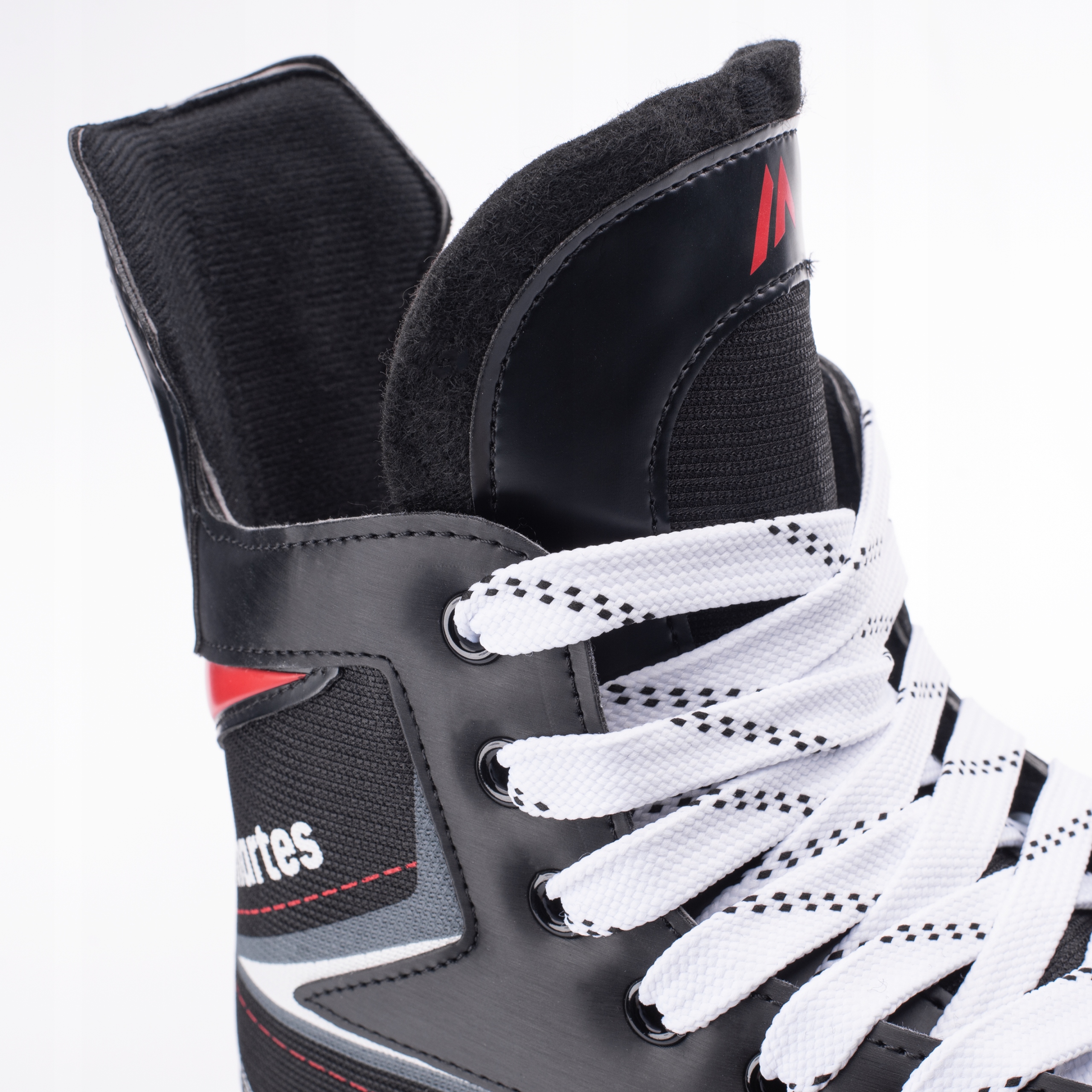 Хоккейные коньки RANF от Martes предназначены для любительского катания. Высокий, жесткий верх обеспечивает адекватную поддержку лодыжки, защищая от травм и повышая уверенность при резких маневрах. Внутренняя часть обуви покрыта мягкой подкладкой, которая не только защищает от холода, но и эффективно отводит влагу, сохраняя ногу в оптимальных условиях. Система шнуровки позволяет обуви хорошо прилегать к ноге. Усиленный носок защищает пальцы, например. против удара шайбы. Салазки изготовлены из нержавеющей стали, что продлевает срок их службы.