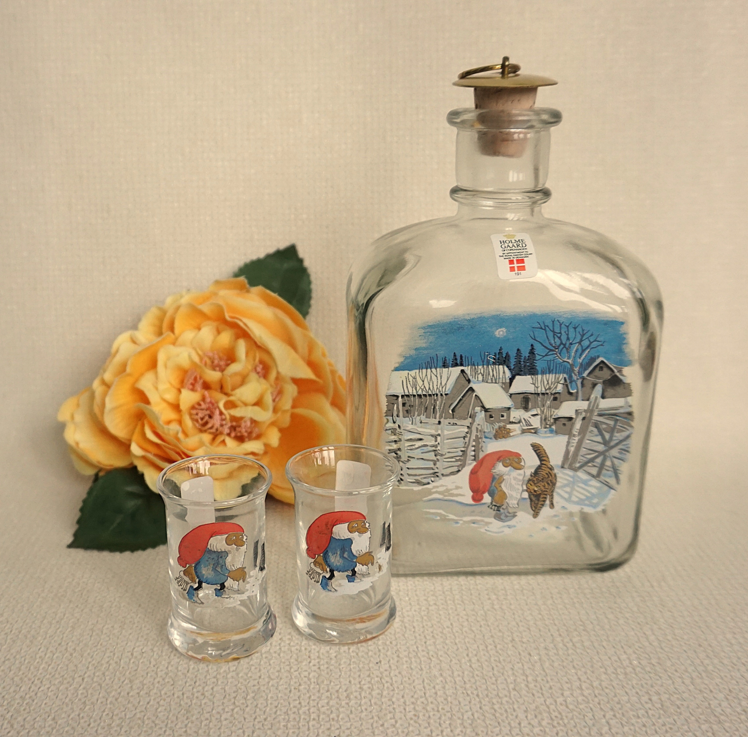 Графин и стаканы выполнены из довольно толстого стекла. Бесцветное, прозрачное стекло. Красивое, стильное украшение на пузиках: зимний сюжет с гномом в красной шапке.
