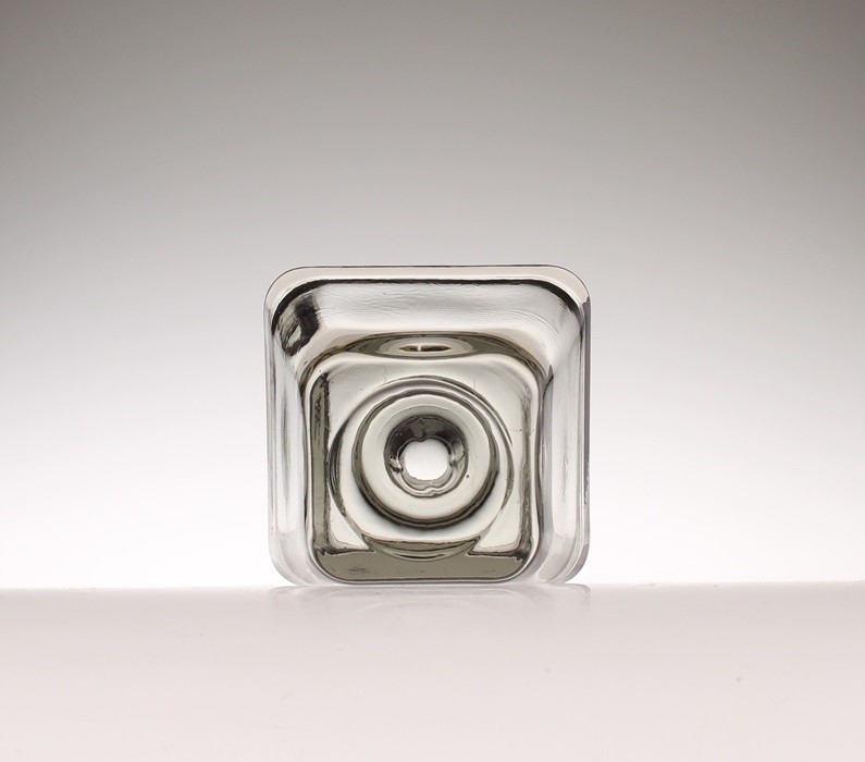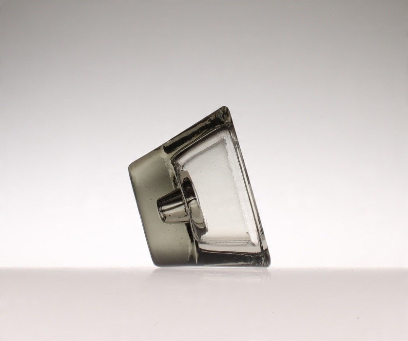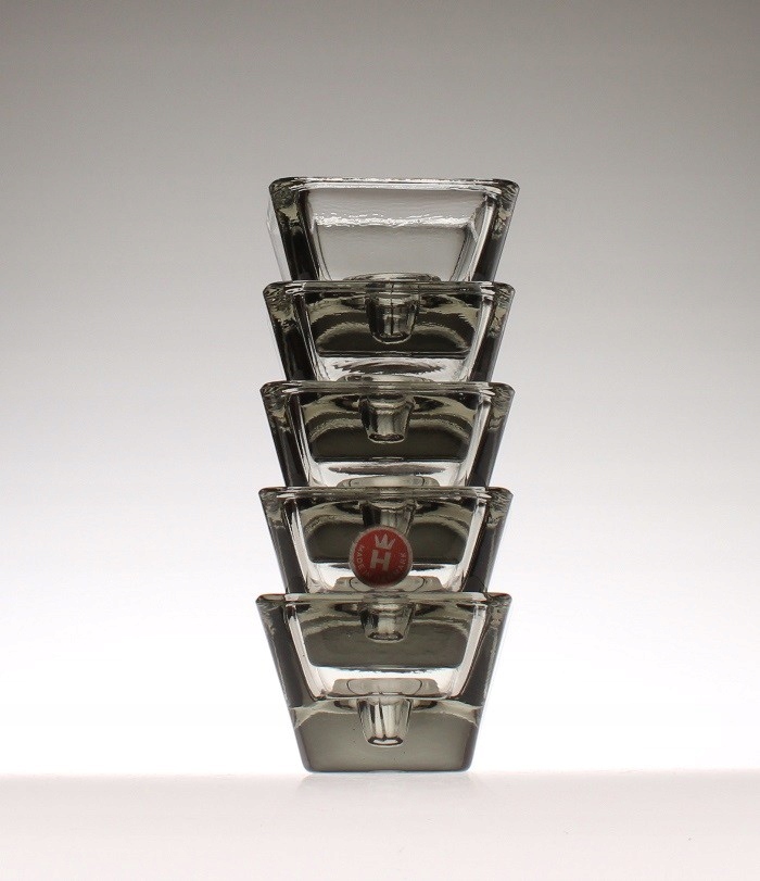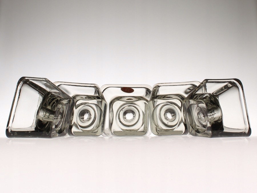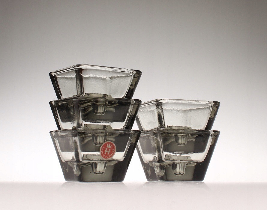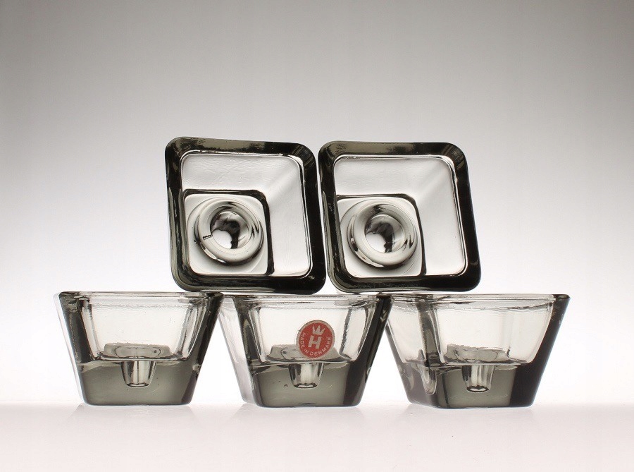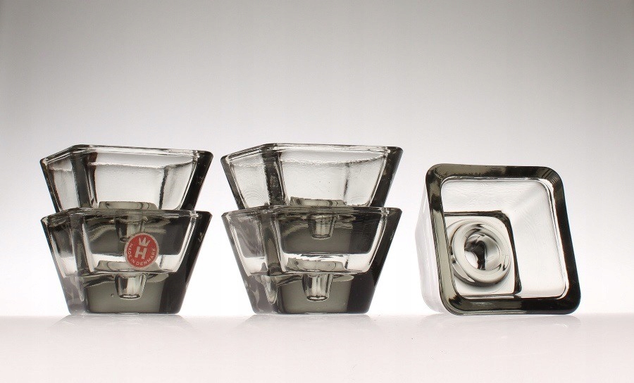 Пять квадратных подсвечников из дымчатого прессованного стекла. Они производятся датским лейблом Holmegaard. 1960-е годы.